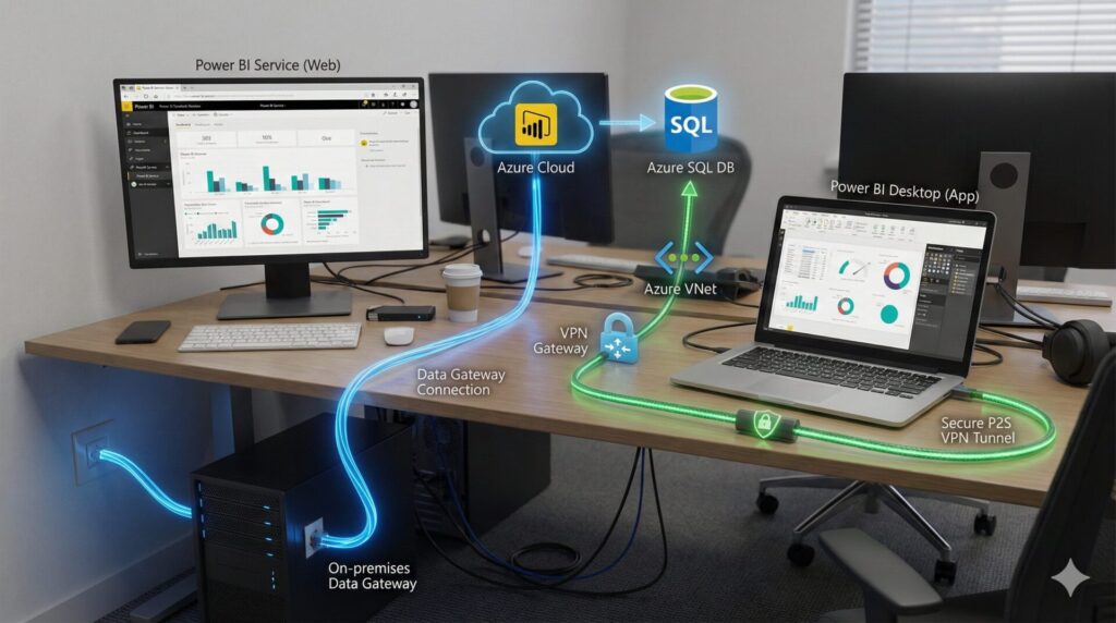 はじめに 前回の記事では、Azure VPN Gateway(P2S)を導入し、ローカル PC から閉域網内の SQL Database へ直接アクセスする「開発環境」を構築しました。 しかし、レポートを作成し、Power BI Service(クラウド)へ 「発行」 してみると……思わぬ壁にぶ... -