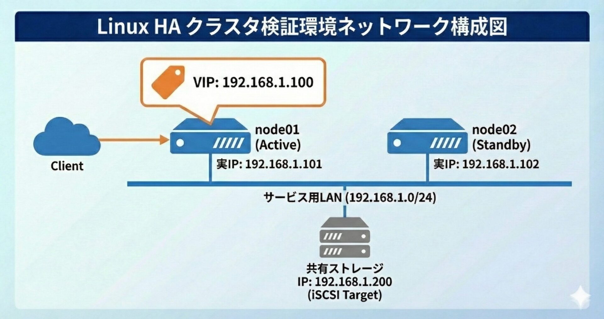本記事では、以下の構成で Web サーバーの HA クラスタを構築します。 シンプルですが、実用的な Active/Standby 構成の基本形です。