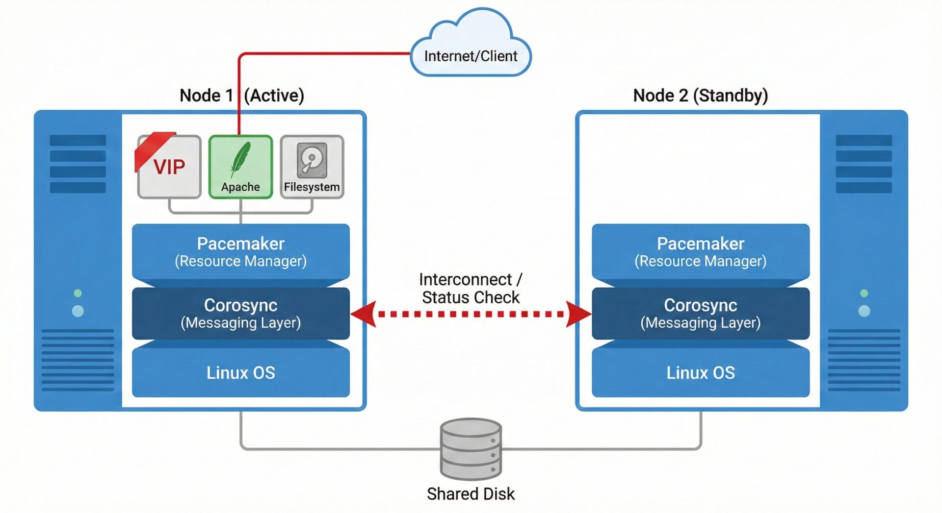 一般的には 「稼働系(Active)」 と 「待機系(Standby)」 の2台で構成され、稼働系に障害が発生すると、Pacemaker がそれを検知し、瞬時に待機系へサービス(IP アドレスや Web サーバーなど)を引き継ぎます(フェイルオーバー)