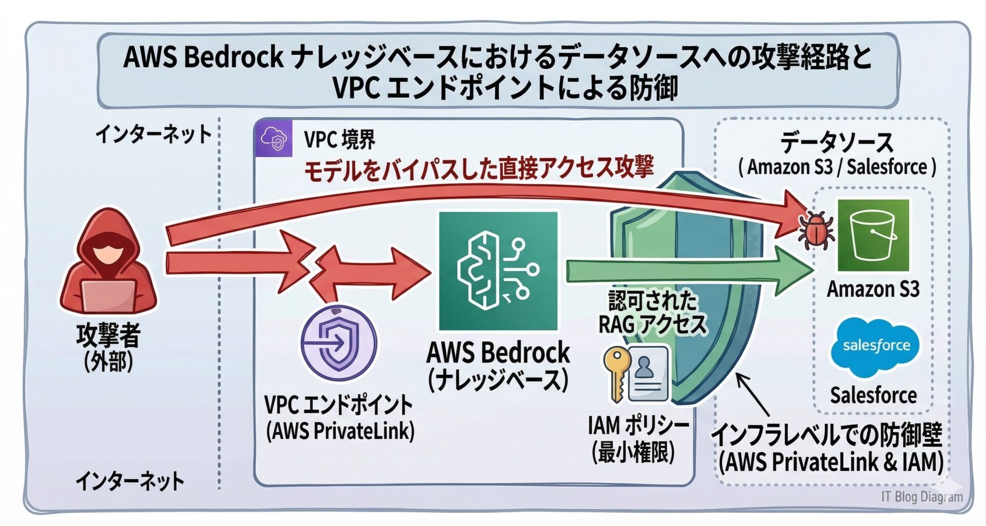 ナレッジベースとして機能する S3 バケットやベクトルデータベースへのアクセス権限(IAM ポリシー)は、Bedrock のサービスロールのみに限定し、人間や他のアプリケーションからの直接アクセスを最小権限の原則に基づいて遮断することが不可欠です。また、VPC エンドポイント(AWS PrivateLink)を利用して Bedrock とデータストア間の通信をプライベートネットワーク内に閉じ込め、インターネット経由の不正アクセス経路を物理的に排除するアーキテクチャ設計が推奨されます。