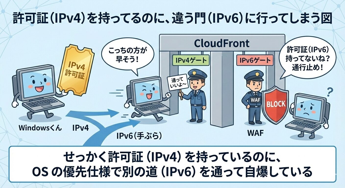 WAF の許可リストに IPv4 しか書いていないと、IPv6 で来た通信は「許可外」として弾かれる。