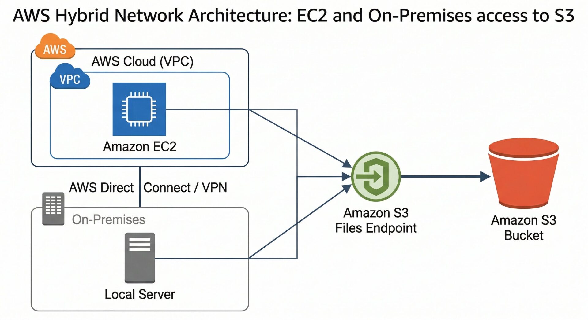 社内のローカルサーバーや研究室のワークステーションなど、AWS 外部のオンプレミス環境から S3 Files にアクセスする場合、セキュリティの観点から AWS Direct Connect または AWS Site-to-Site VPN を経由した閉域網接続の利用が推奨されます。