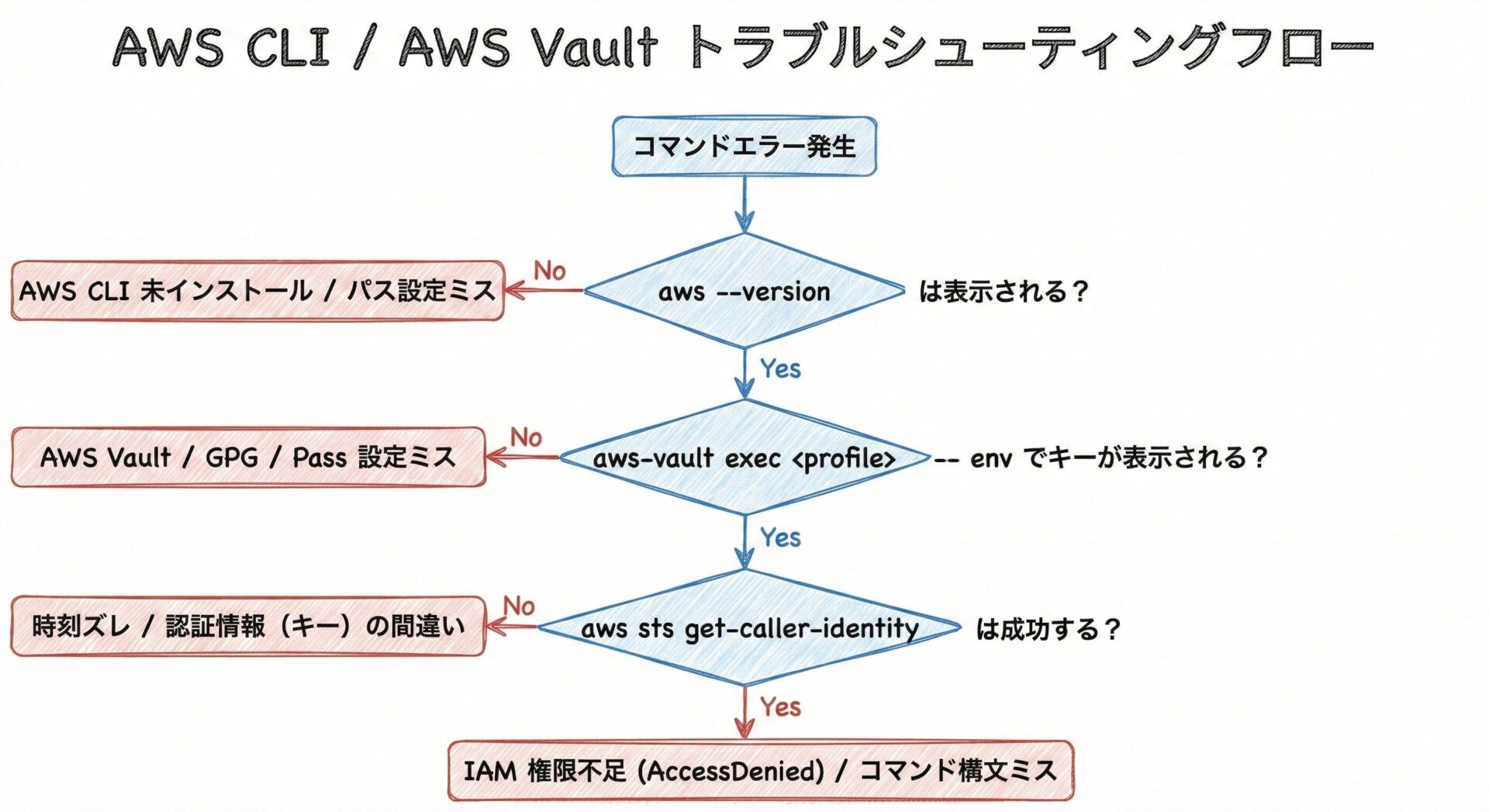 AWS CLI や AWS Vault は、一度設定してしまえば非常に快適なツールですが、導入初期や久しぶりに使う際、「謎のエラー」 に遭遇してハマることがよくあります。