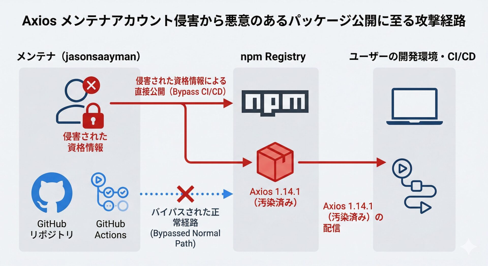 攻撃者は、Axios の主要なメンテナである「jasonsaayman」のアカウントを侵害し、GitHub Actions の CI/CD パイプラインを介さずに、npm レジストリへ直接悪意のあるバージョンを公開しました。
