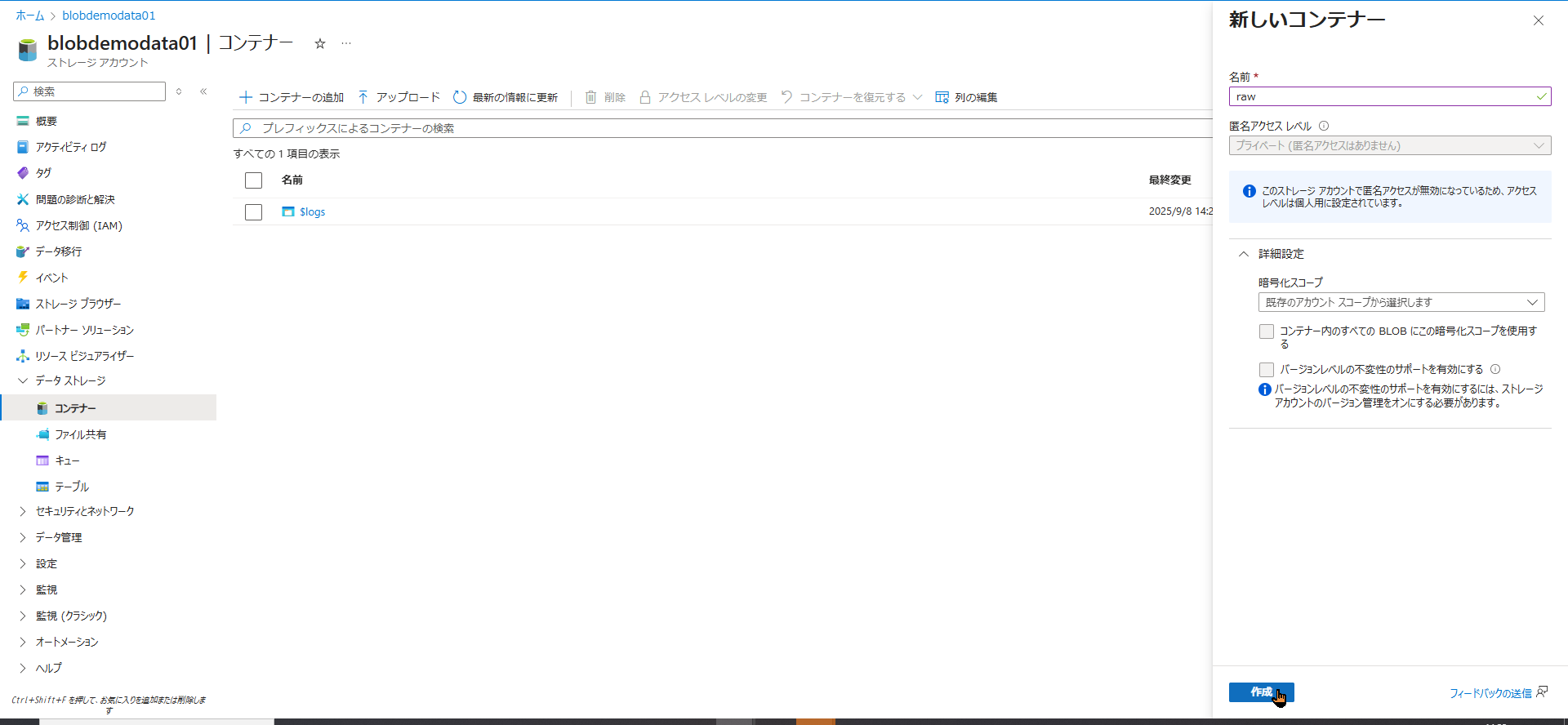 まずはストレージアカウントを作成し、raw