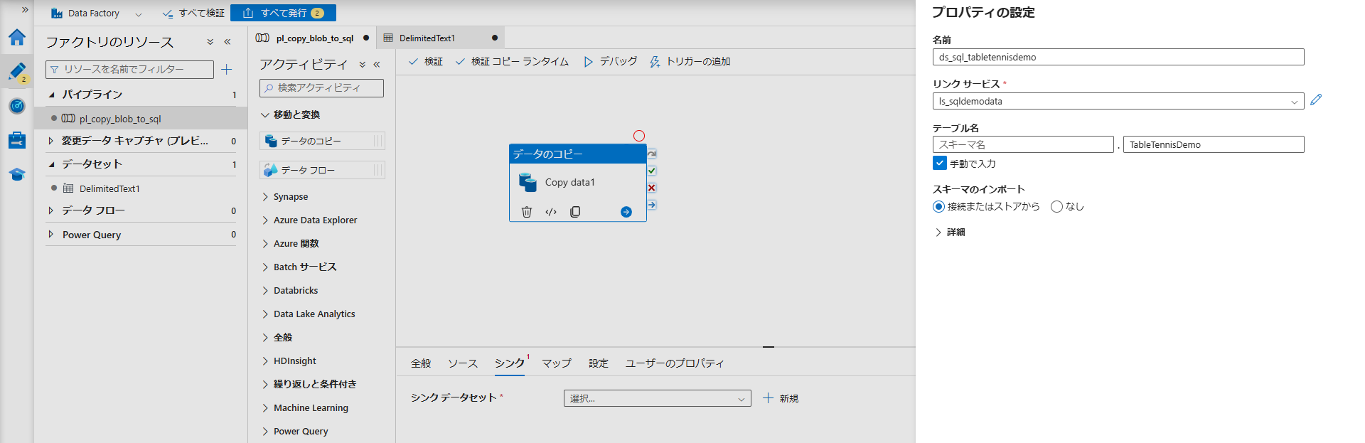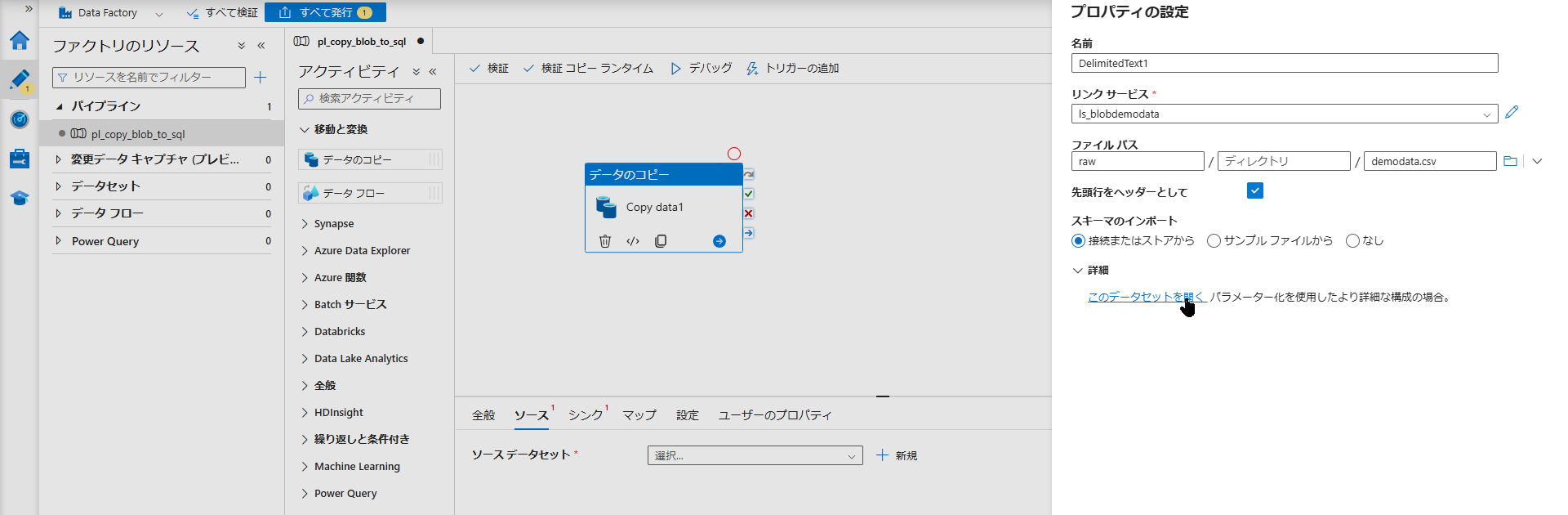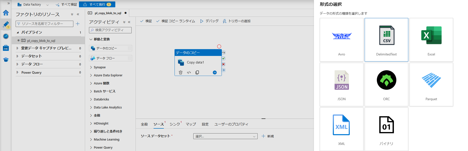 Data Factory のパイプライン構築は、AWS Glue Studio よりも視覚的で理解しやすいと感じた。