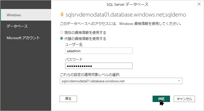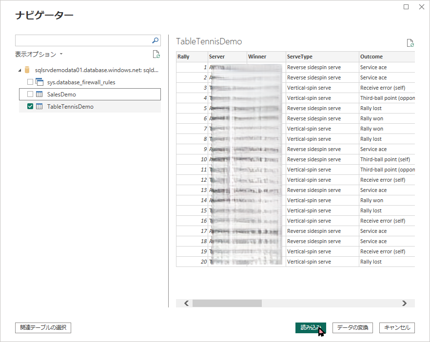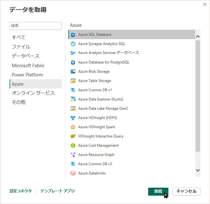 「データの取得」→「Azure SQL Database」