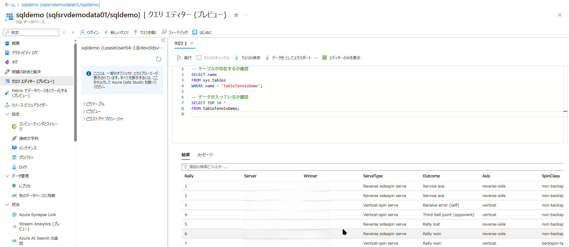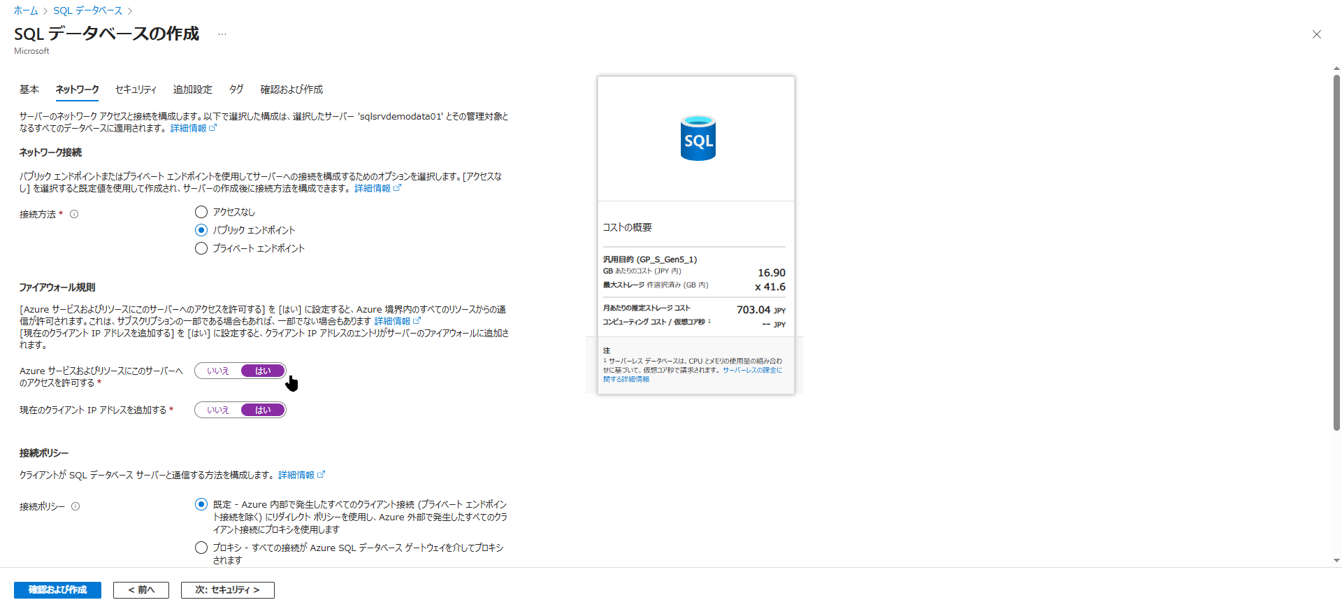 SQL サーバーを作成し、例として sqldemo