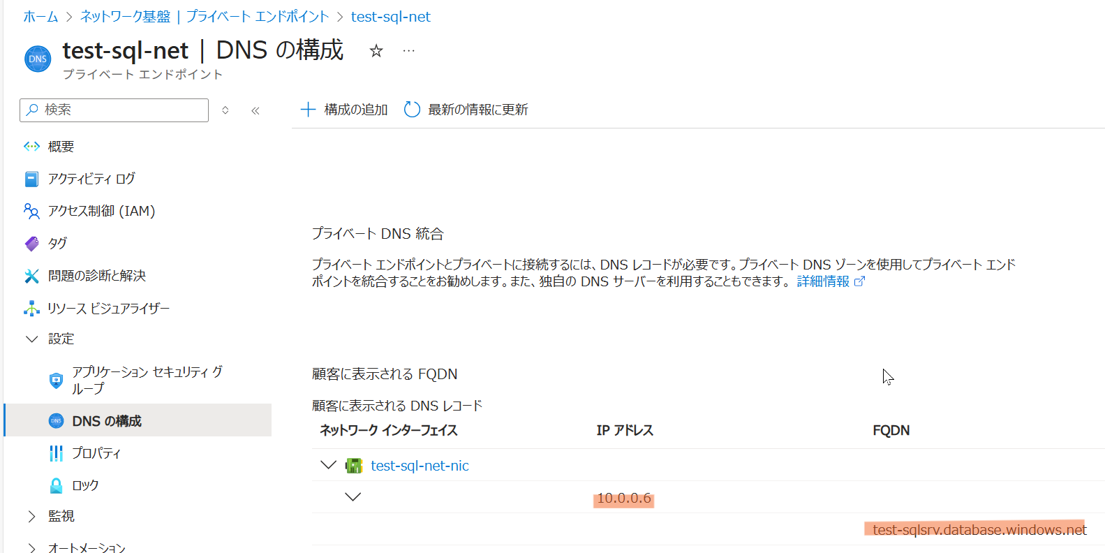 10.0.0.6 test-sqlsrv.database.windows.net- 設定の確認(Ping コマンド)