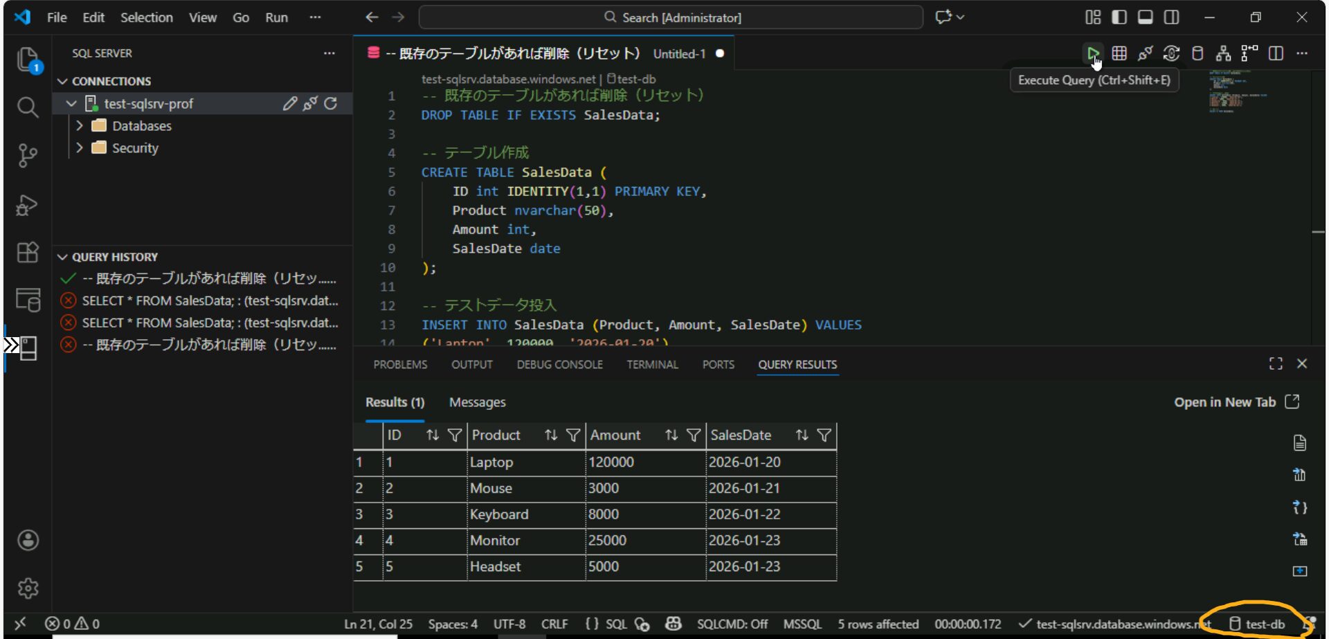 SELECT * FROM SalesData;- 実行結果の確認