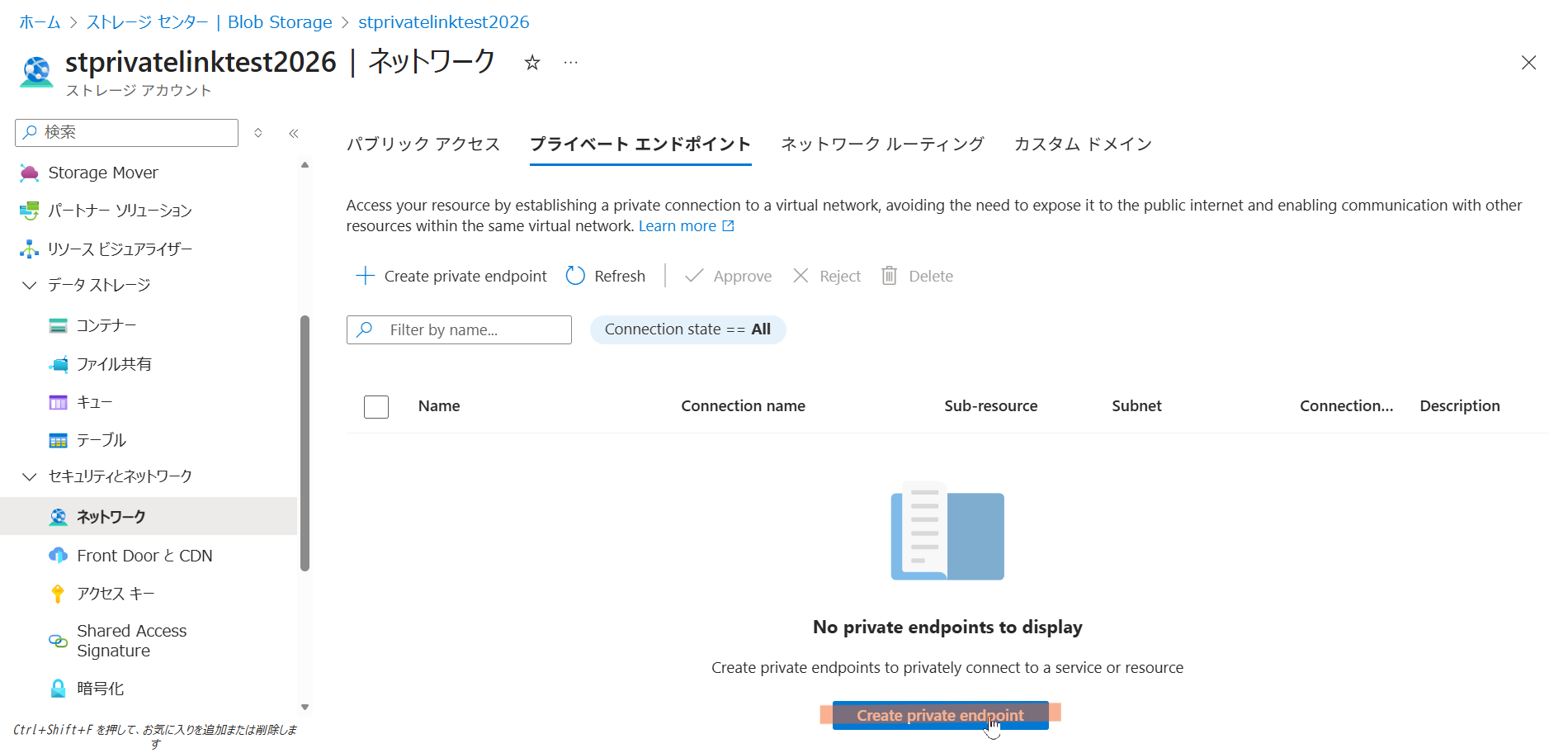 Private Endpoint は「Private Link センター」からも作成できますが、接続したいリソース(今回の場合は Storage)の画面から作成する方が設定が自動入力されるため簡単です。