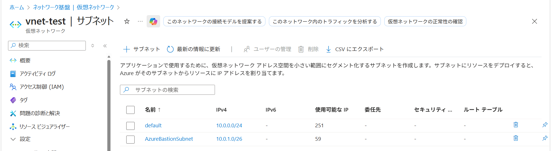 • 今回の VNet (vnet-test) が一覧にあるか確認します。