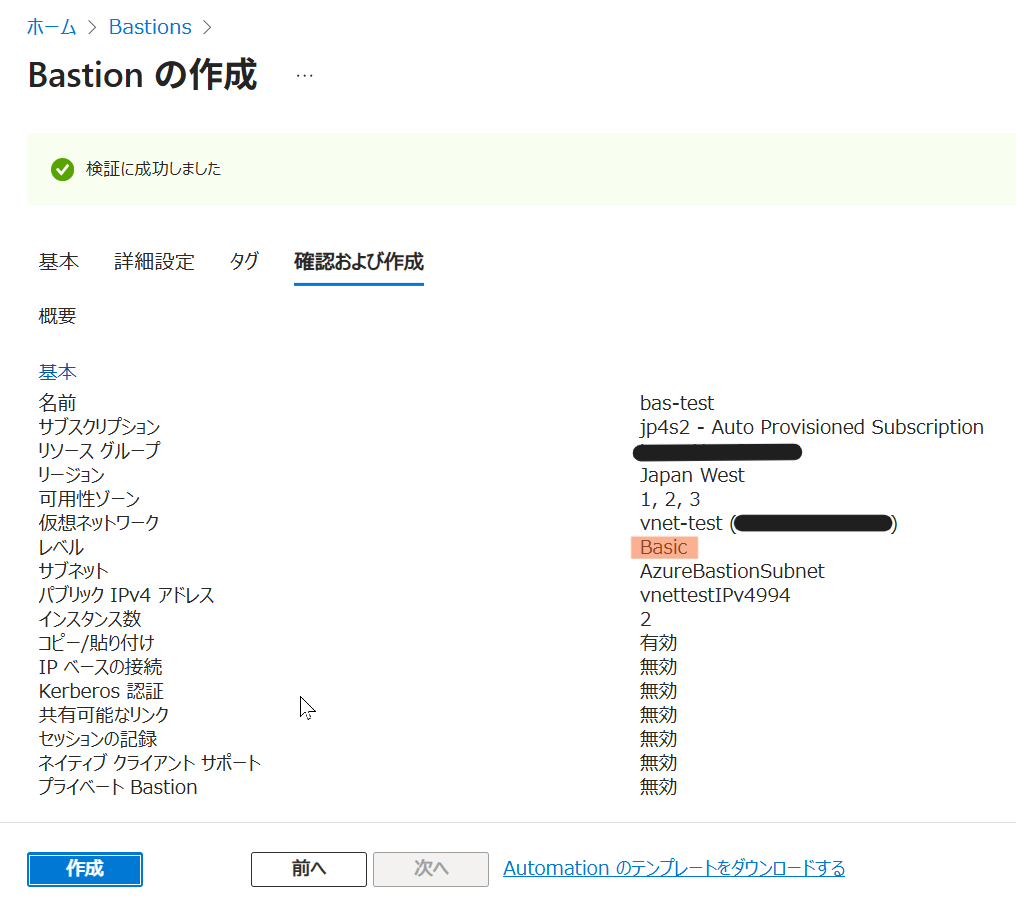 次に、ブラウザ経由で VM に RDP 接続するための Bastion を作成します。今回はファイル転送機能を使わない(VM 内で直接 DL する)ため、安価な Basic SKU を使用します。