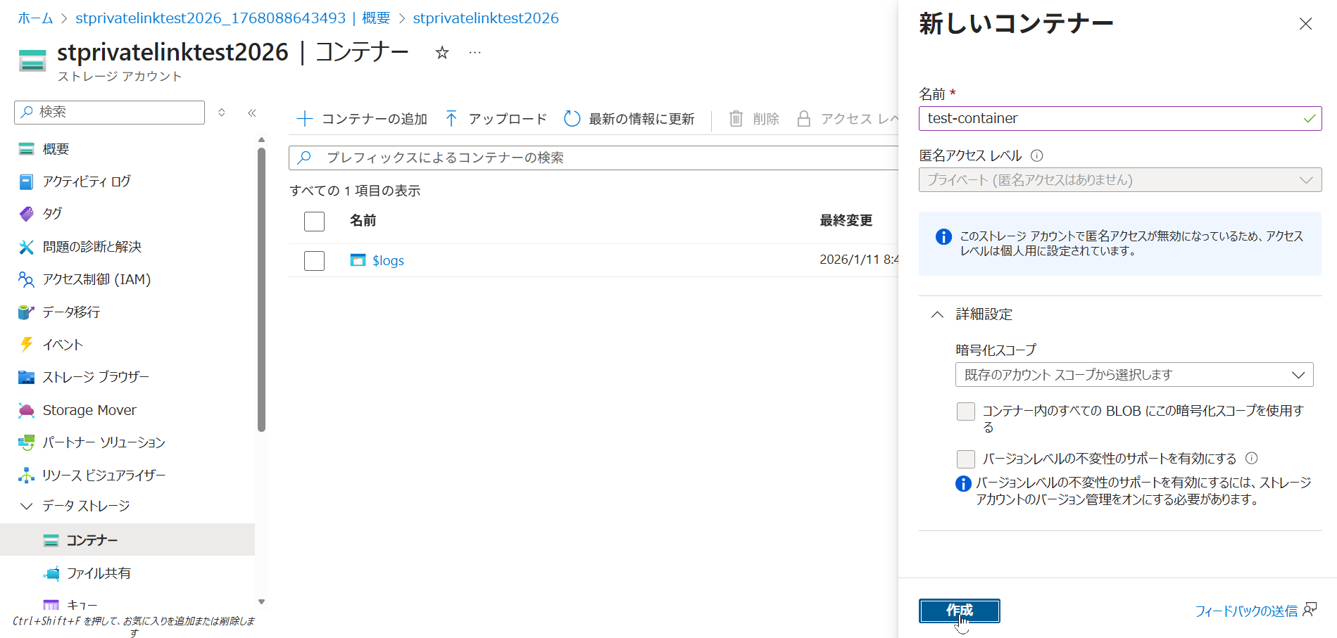 • ストレージアカウント名:全世界で一意の名前 を入力してください (例: stprivatelinktest2026)
