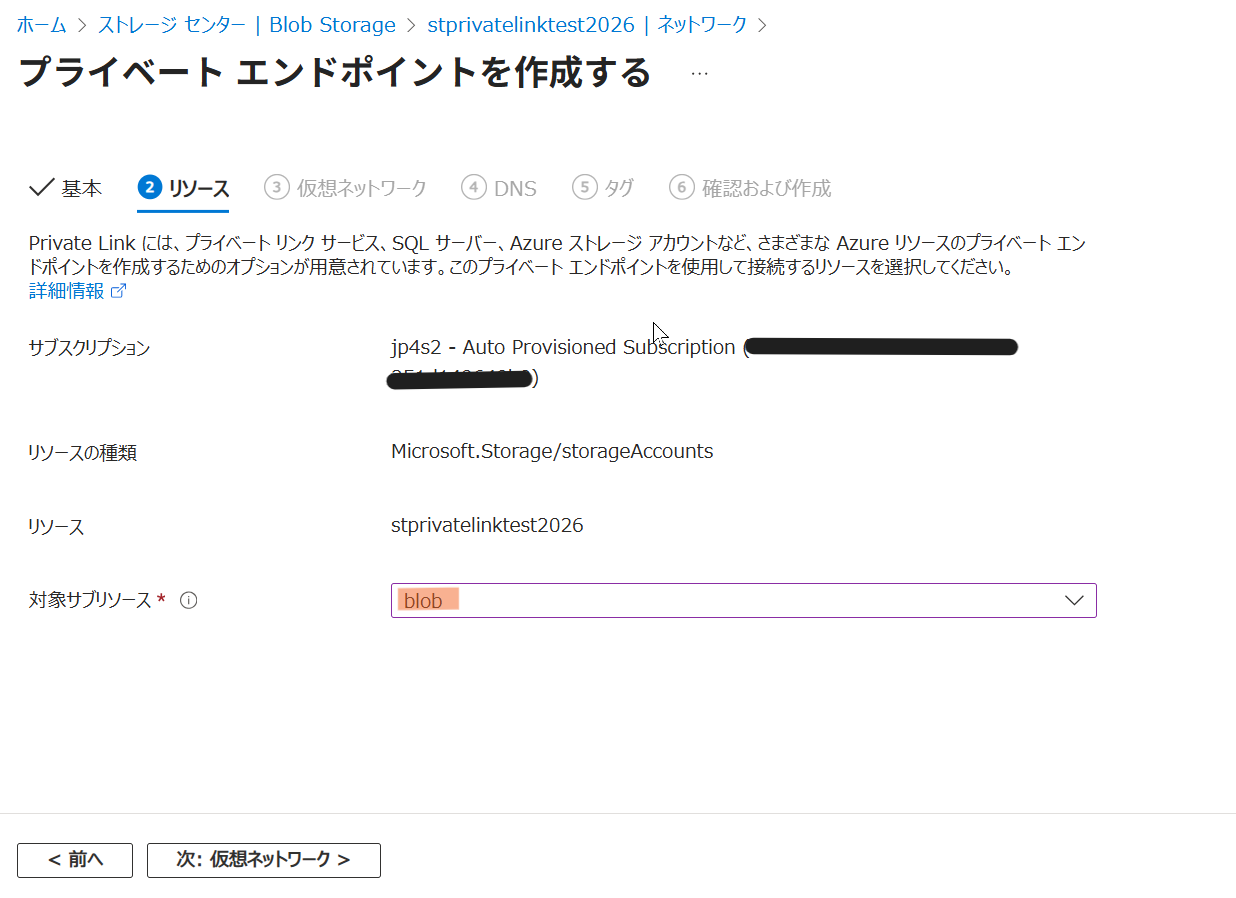 • アカウント名: 作成したストレージアカウント名 (stprivatelinktest...)