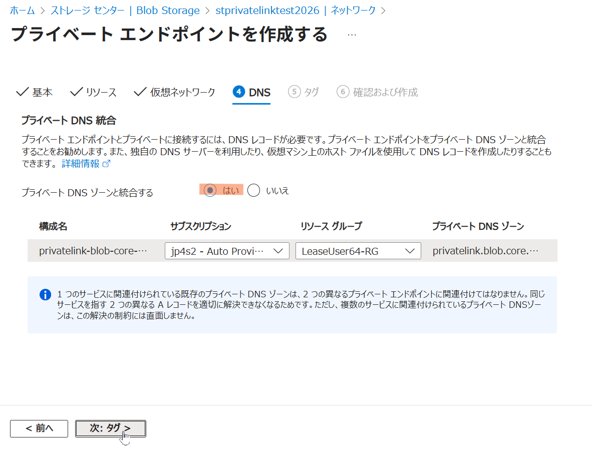 3. プライベート DNS ゾーン: (新規) privatelink.blob.core.windows.net となっていることを確認します。