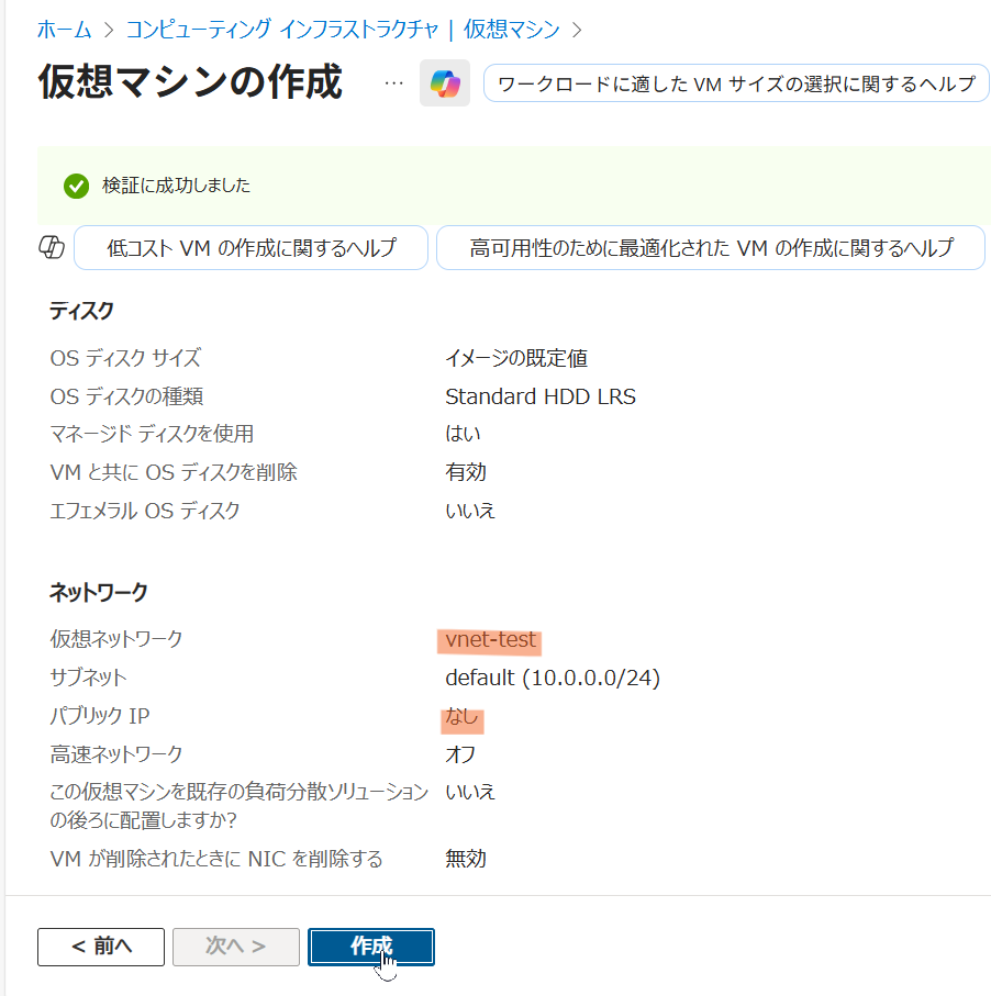 • 仮想ネットワーク: 作成済みの vnet-test を選択。