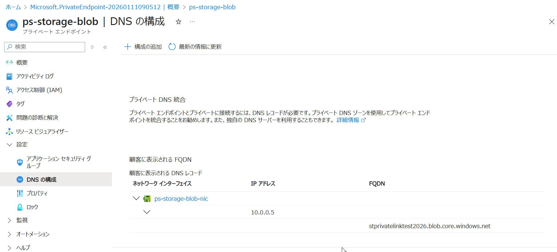 2. デプロイが完了したら、作成された「Private Endpoint」のリソースへ移動し、[DNS 構成] メニューを確認してください。