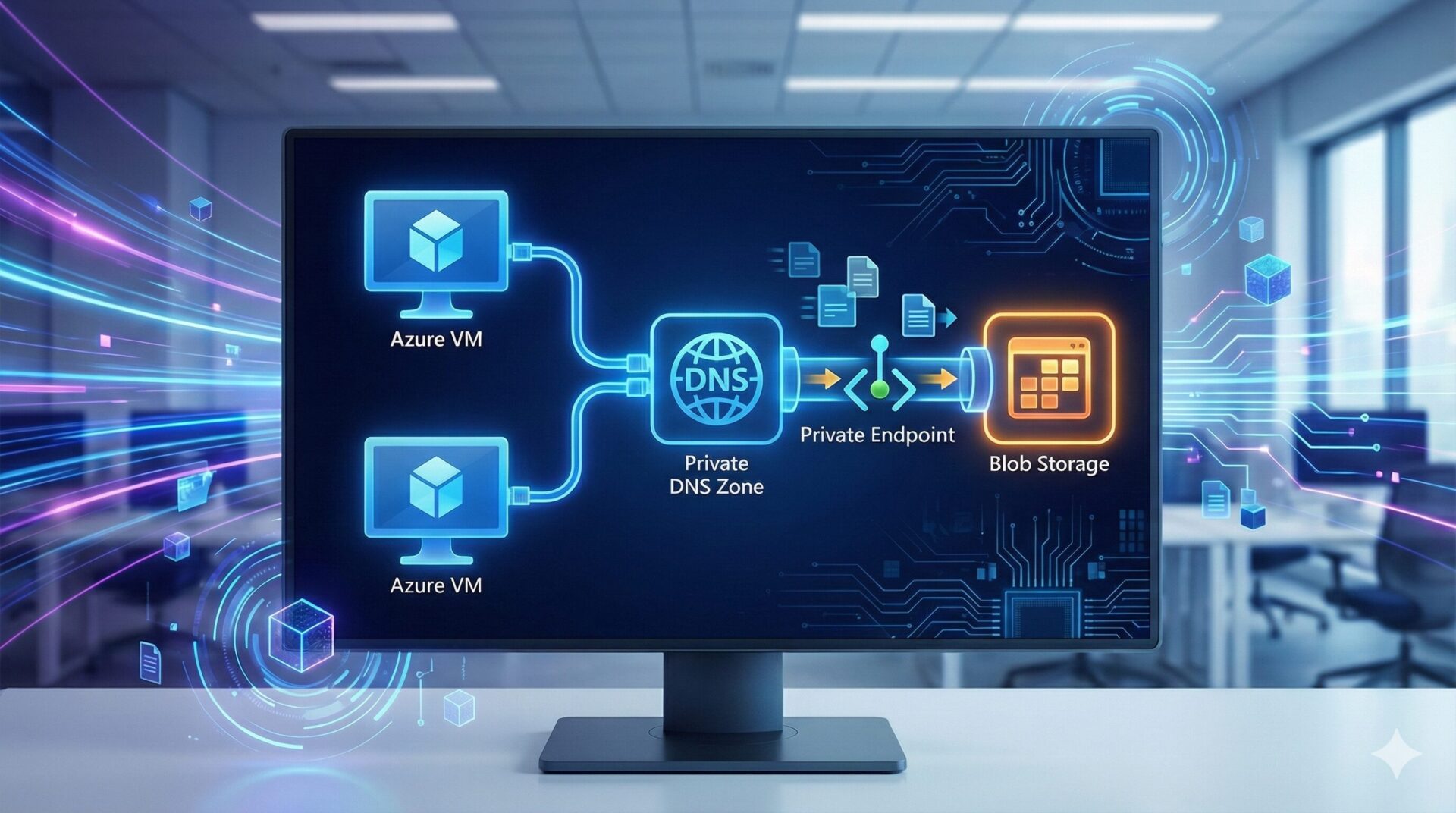 Private Endpoint を有効にしても、接続先の URL(FQDN)は mystorage.blob.core.windows.net のまま変わりません。 しかし、クライアント(VM)がこの URL にアクセスしようとした際、通常の DNS(インターネット上の電話帳)を使ってしまうと、「パブリック IP」 が返ってきてしまいます。これでは Private Endpoint を通りません。