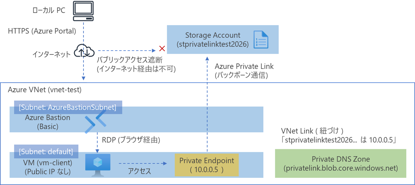 今回は以下の構成を作成します。 クライアントとなる仮想マシン(VM)はパブリック IP を持たず、インターネットから隔離されています。 VM から Storage へのアクセスは、Private Endpoint を介して Azure のバックボーンネットワークのみを通ります。