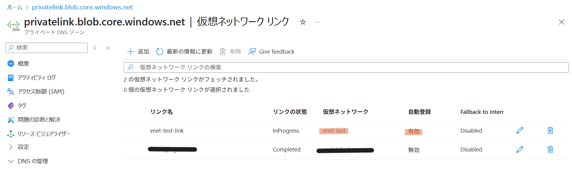 • 作成された Private DNS ゾーン (privatelink.blob.core.windows.net) を開きます。