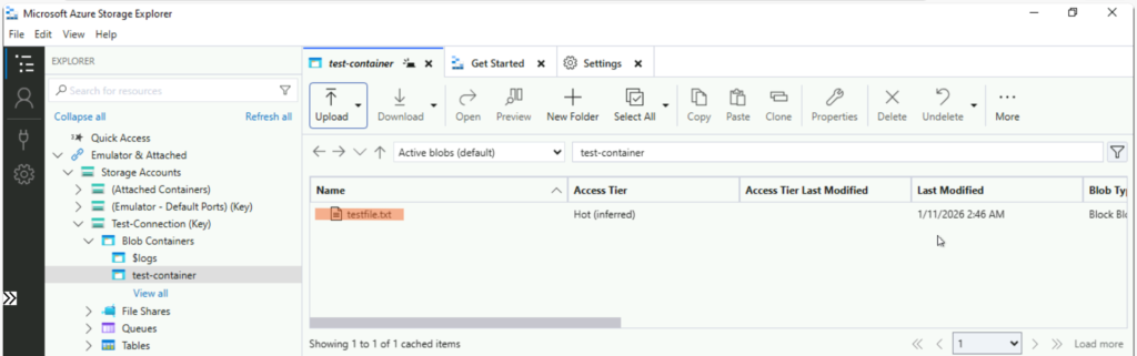 1. 左ツリーに接続したストレージが表示されるので、[Blob Containers] > [test-container] を開きます。