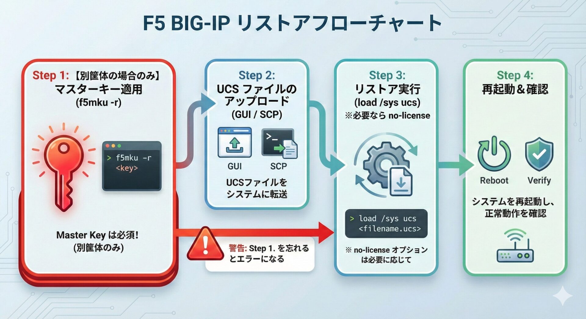 BIG-IP のバックアップ運用で、多くのエンジニアが躓くのが 「別筐体へのリストア失敗」 です。 その原因のほとんどは、「マスターキー(Master Key)」の不一致 にあります。