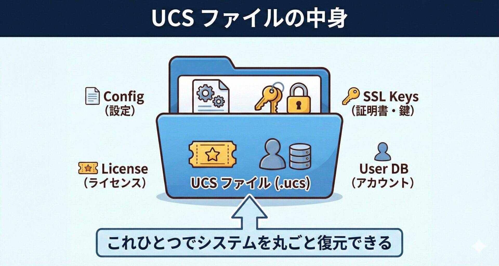 システム全体を復元するために必要な、以下の重要データを丸ごと圧縮して固めた 「アーカイブファイル(拡張子は .ucs)」 です。