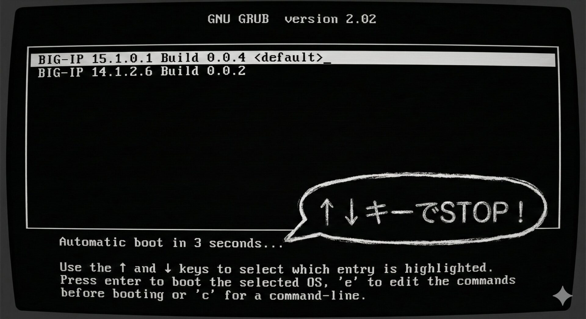 矢印キーを使って、普段起動している(または起動したい)BIG-IP のバージョンを選択します(通常は一番上にあります)。 選択された状態で、キーボードの 【 e 】 キーを押します。