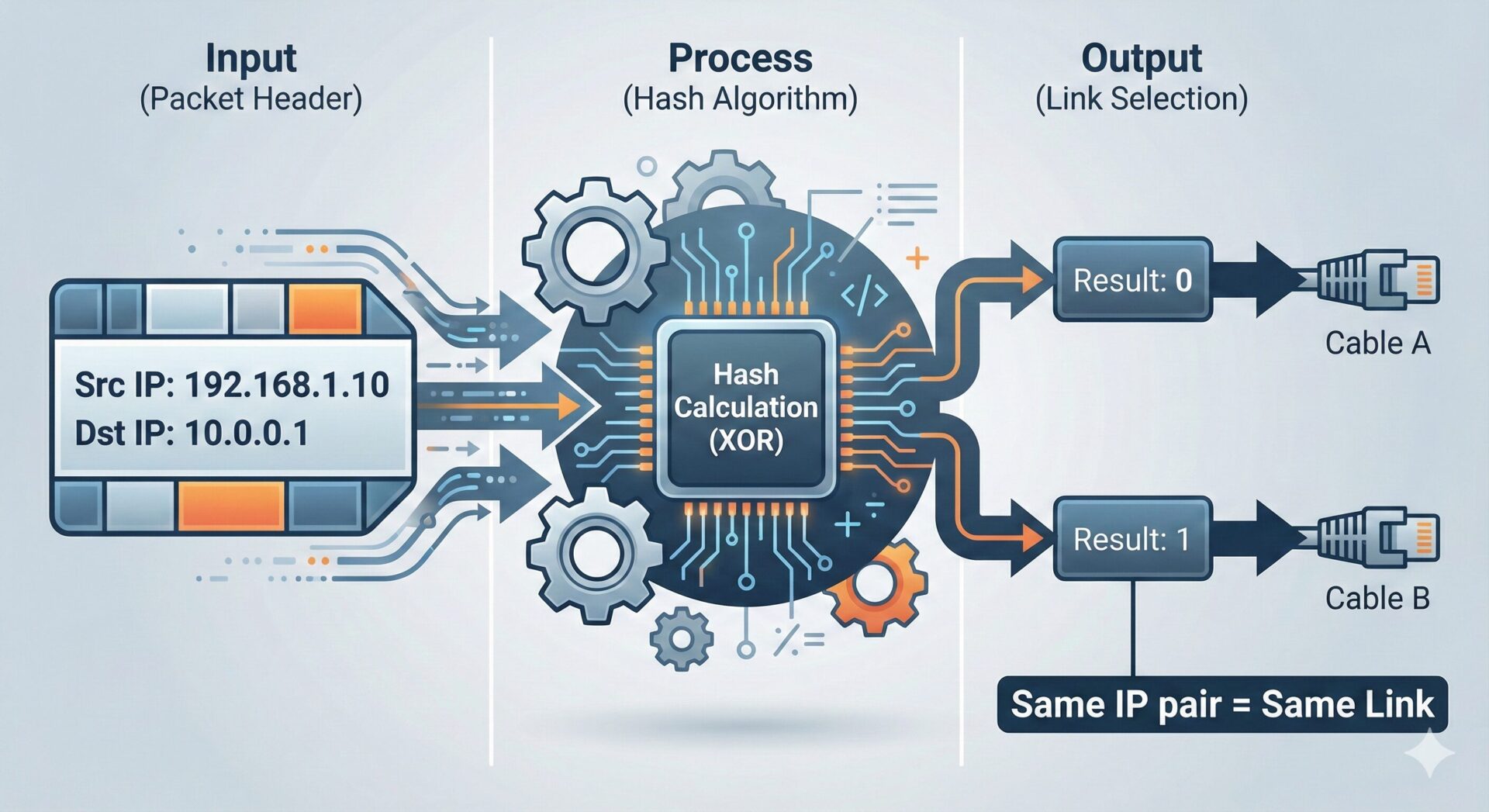 - 出力: 計算結果(ハッシュ値)に基づいて、物理ポート(Link A または Link B)を決定
