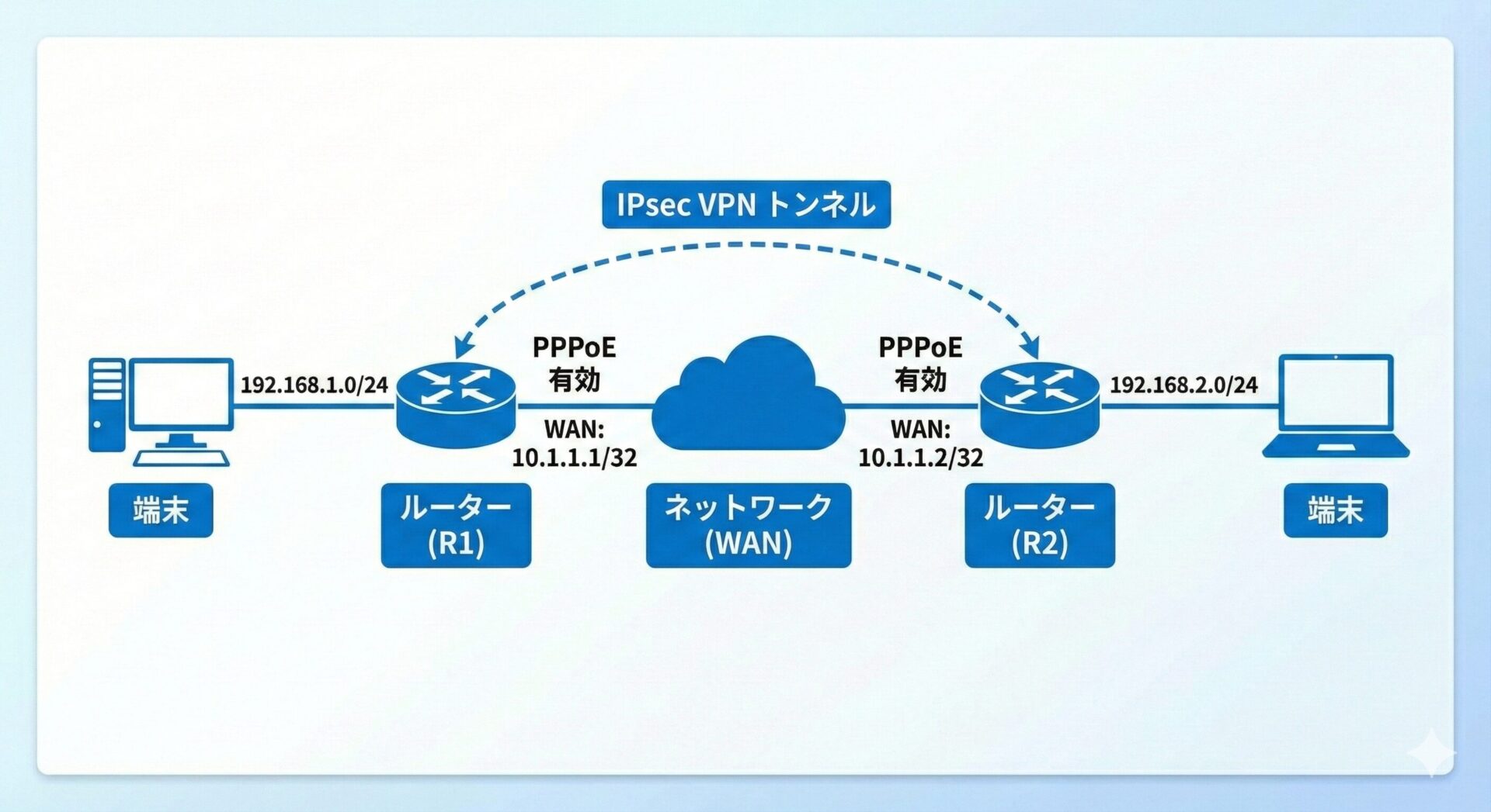今回は、インターネット(PPPoE 接続)を介して、本社(R1)と支社(R2)を接続するシナリオを想定します。