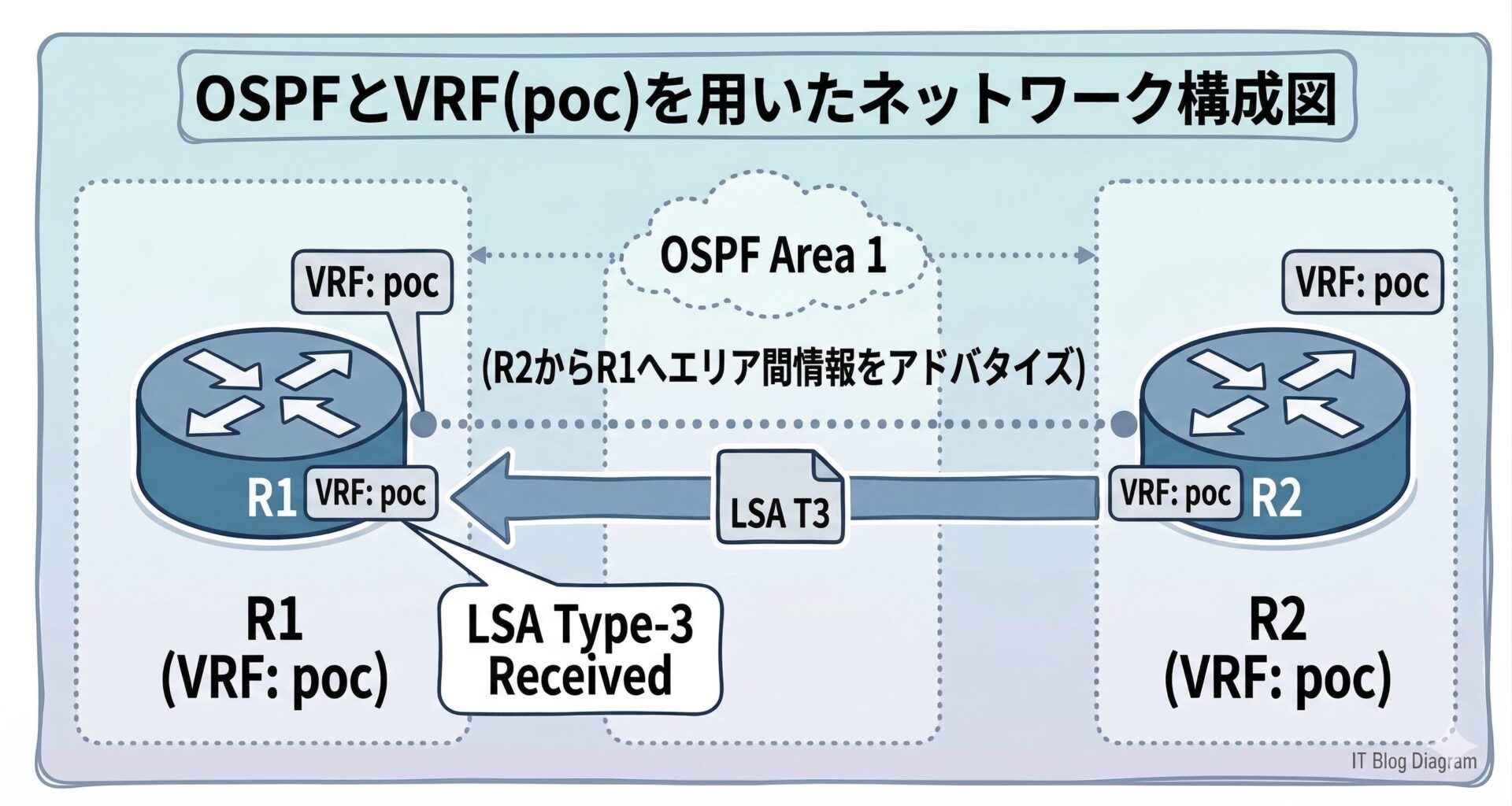 一般的な OSPF ネットワークにおいて、エリアを跨いでルート情報を伝播させる際には、 ABR(Area Border Router)によって生成される LSA Type-3(Summary LSA)が利用されます。しかし、 Multi-VRF 環境を構築した際、データベース上には該当の LSA が存在しているにもかかわらず、ルーティングテーブルに反映されないトラブルが発生することがあります。