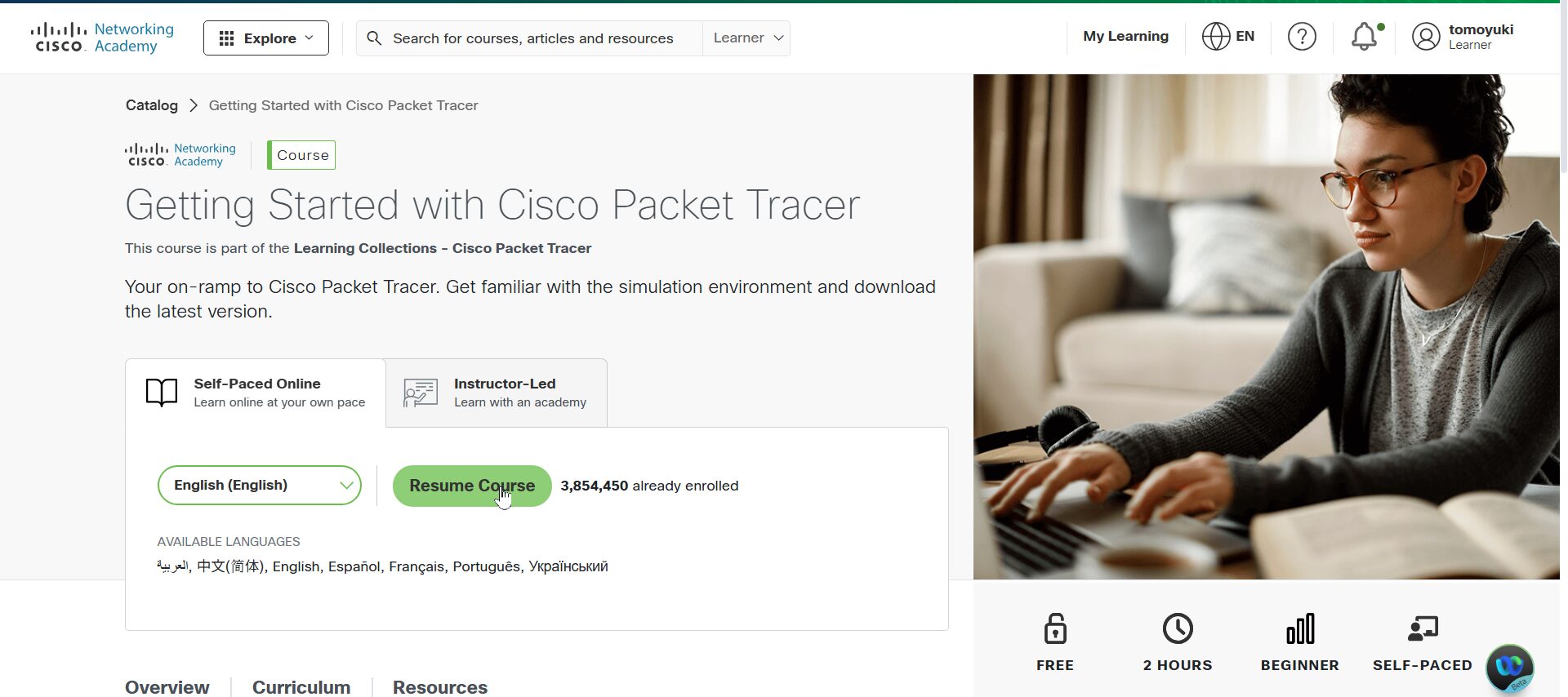 すると、学習画面(コースの最初のページ)が開きます。 画面内に 「Download Cisco Packet Tracer」 というリンク(または “1.0.3 Download Cisco Packet Tracer” といった章)が表示されますので、それをクリックしてください。