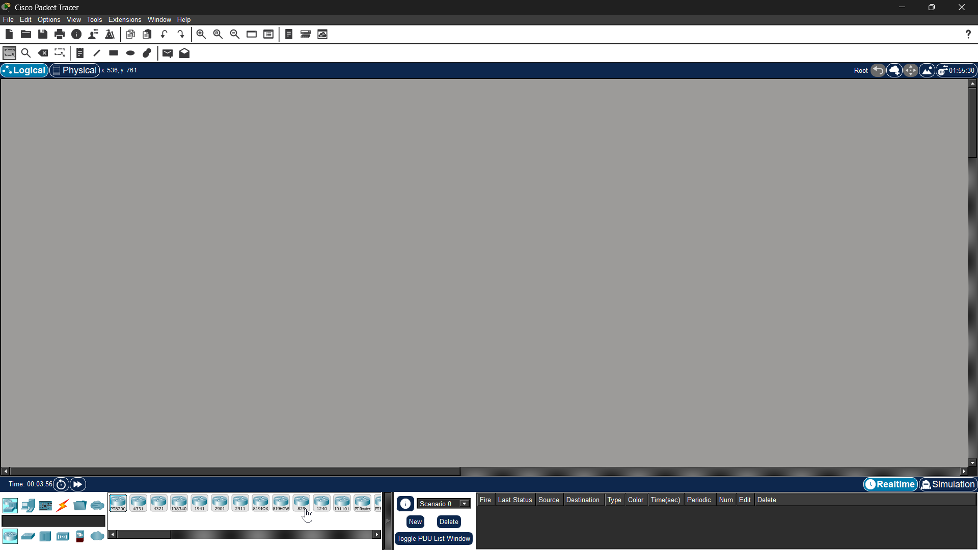 Packet Tracer を起動すると、真っ白なキャンバス(ワークスペース)が表示されます。ここに機器を並べて、ネットワークを作っていきます。