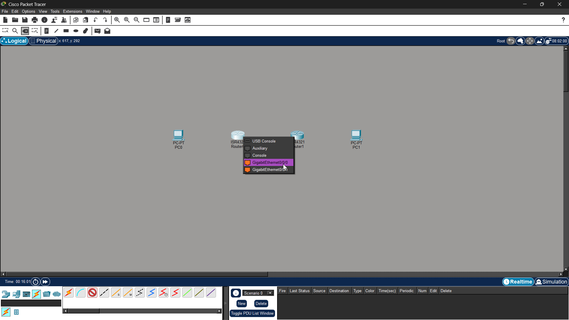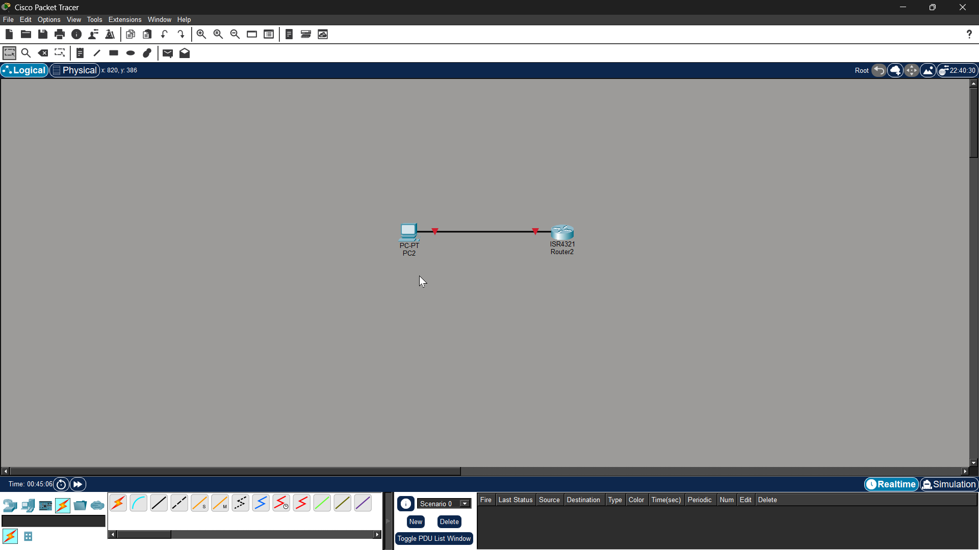 - 配置: ワークスペースに「PC」を1台、「Router(4321など)」を1台置きます。