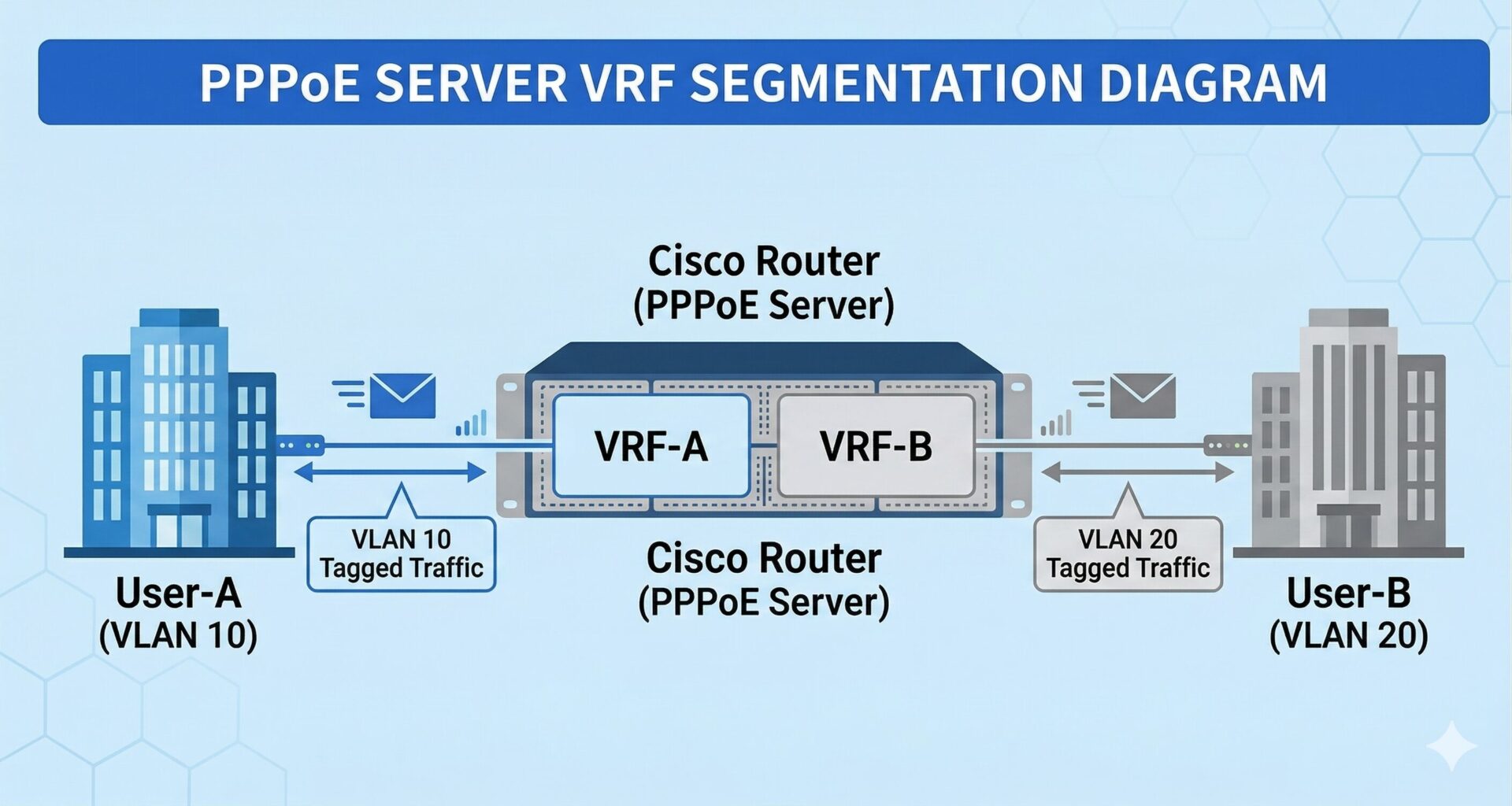 1 台の物理ルータを論理的に分割する VRF (Virtual Routing and Forwarding) を活用することで、 PPPoE サーバとしての柔軟性は飛躍的に向上します。 特に複数の顧客やプロジェクトの検証を同時に行う環境では、 VRF によるマルチテナント構成の導入が 有効な手段 となります。