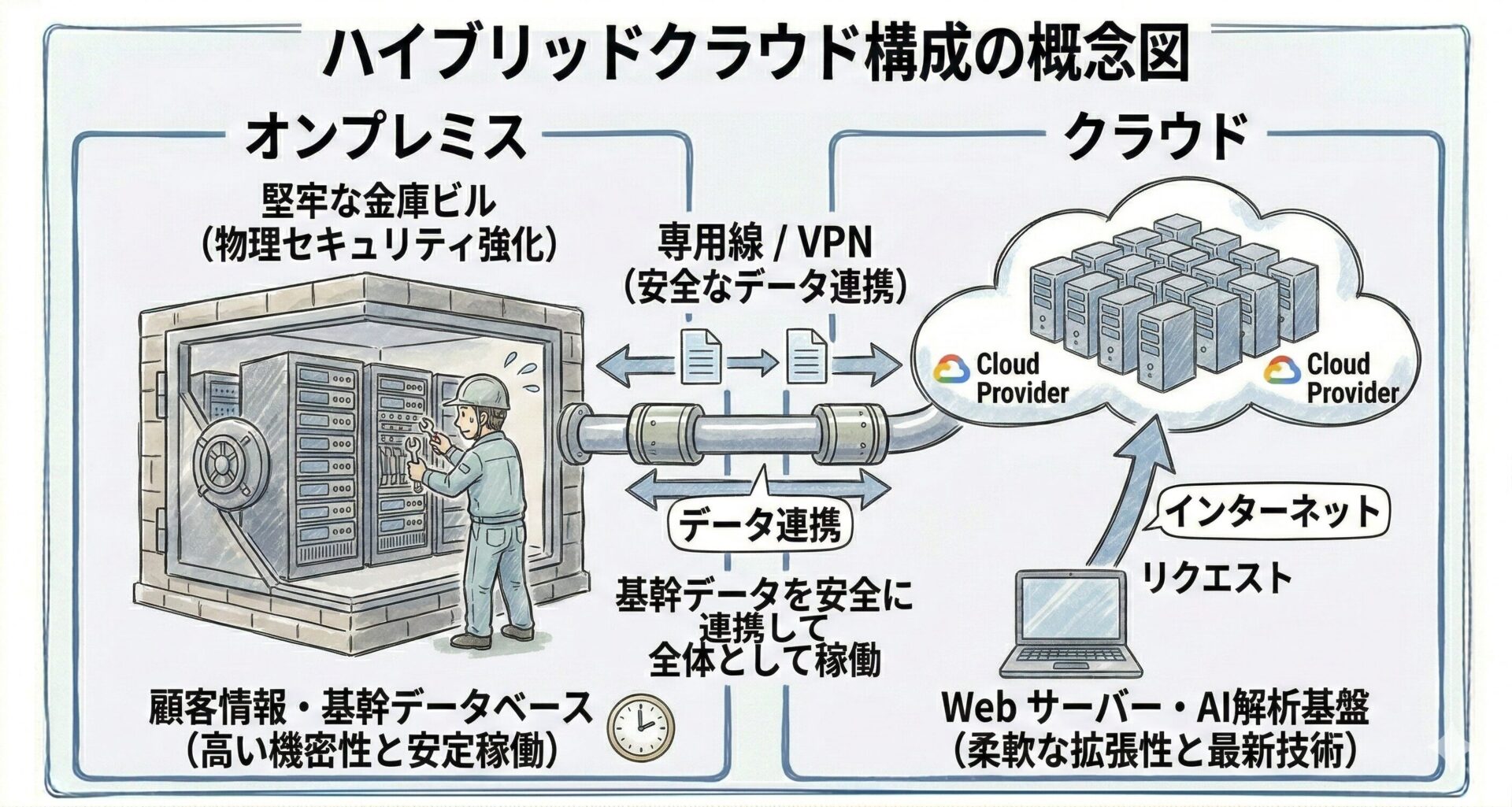 例えば、機密性の高い「顧客データベース」は自社のオンプレミス環境で安全に保管しつつ、アクセス変動が大きく最新技術(AI など)を利用したい「Web フロントエンド」はクラウド上に構築するといった構成です。これにより、セキュリティ水準を担保しながら、コスト最適化と柔軟性を両立させることが可能になります。