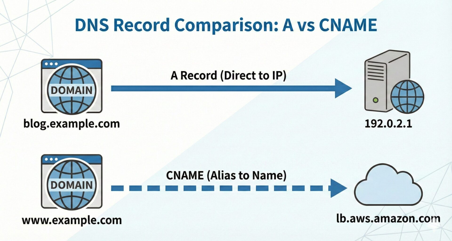 DNS の設定で最も悩むのが「A レコードと CNAME レコード、どっちを使えばいいの?」という点です。 基本的な使い分けの基準は非常にシンプルです。