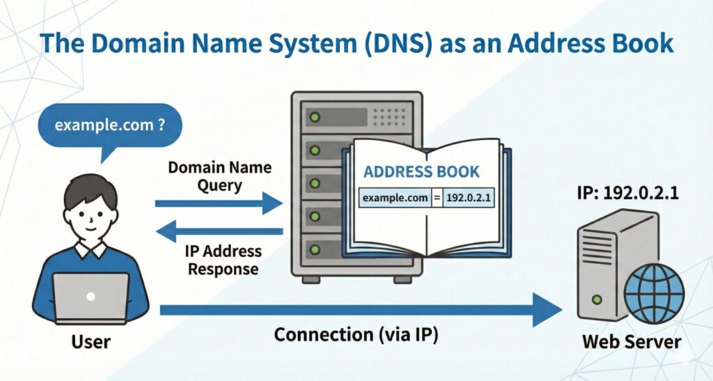 DNS の役割を簡潔に言うと、「インターネット上の電話帳(アドレス帳)」 です。 コンピュータ同士は「IP アドレス(例: 192.0.2.1)」という数字の羅列でお互いを認識していますが、私たち人間にとって、この数字をすべて覚えるのは不可能です。そこで、「google.com」や「mytech-blog.com」といった覚えやすいドメイン名を使い、それを DNS が裏側で瞬時に IP アドレスへ変換(名前解決)してくれています。