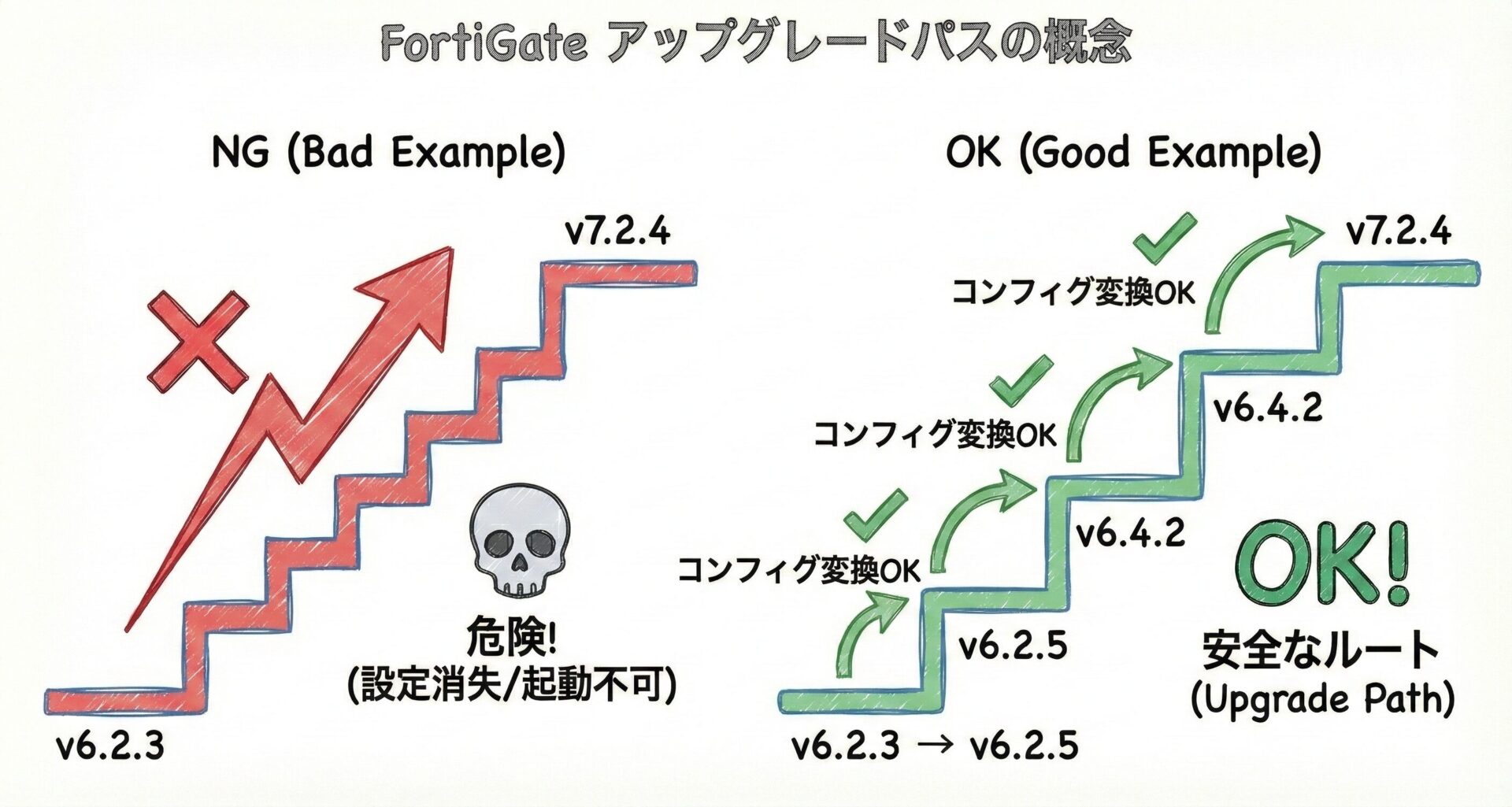 これ防ぐため、Fortinet 社は「v6.2.3 から v7.2.4 に上げたいなら、まずは v6.2.5 に上げて、次に v6.4.2 に上げて…」といったように、設定を正しく引き継げる「安全な階段の登り方」を厳密に定めています。これがアップグレードパスです。