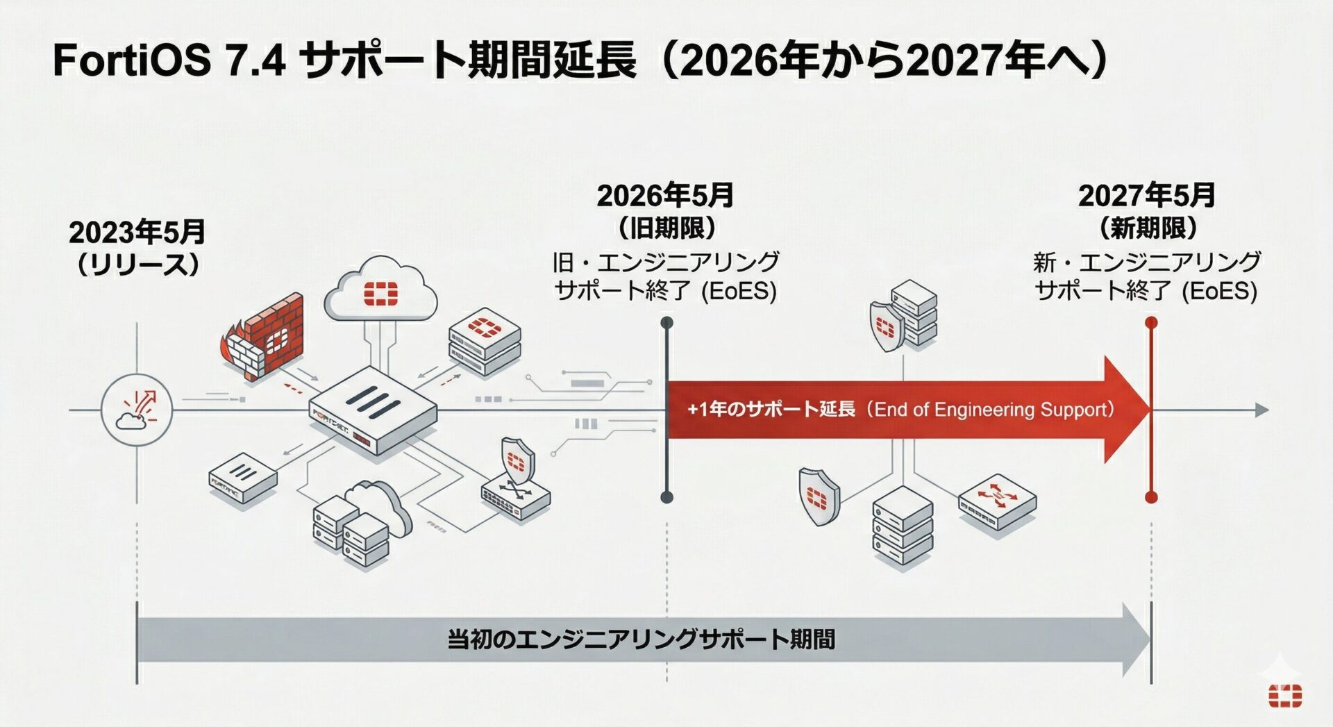 End of Engineering Support とは、メーカーによるソフトウェアのバグ修正やパッチ提供が行われる最終日を指します。この期間が延長されたことで、現在 FortiOS 7.4 を運用している組織は、急いで次期バージョン(7.6 など)へメジャーバージョンアップを行う必要がなくなり、既存の構成を維持したままシステムを延命するための猶予期間を獲得しました。
