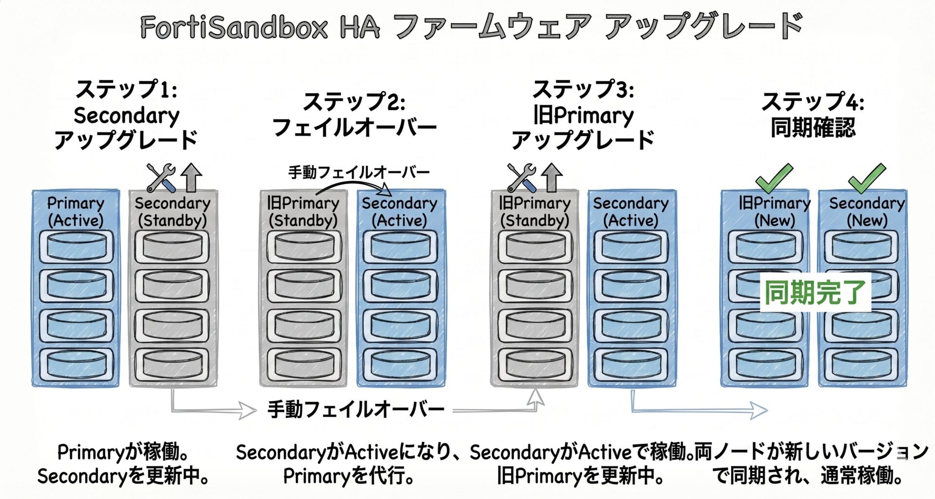 FortiSandbox を HA(High Availability)構成で運用している場合、アップグレードの順序を誤るとクラスタ全体が同時にダウンするリスクがあります。以下の手順は、フェイルオーバーを活用してサービス停止時間を最小限に抑えることを目的としたワークフローです。 ※スタンドアロン構成の場合はメンテナンスウィンドウを確保した上で、通常のアップグレード手順を実施してください。