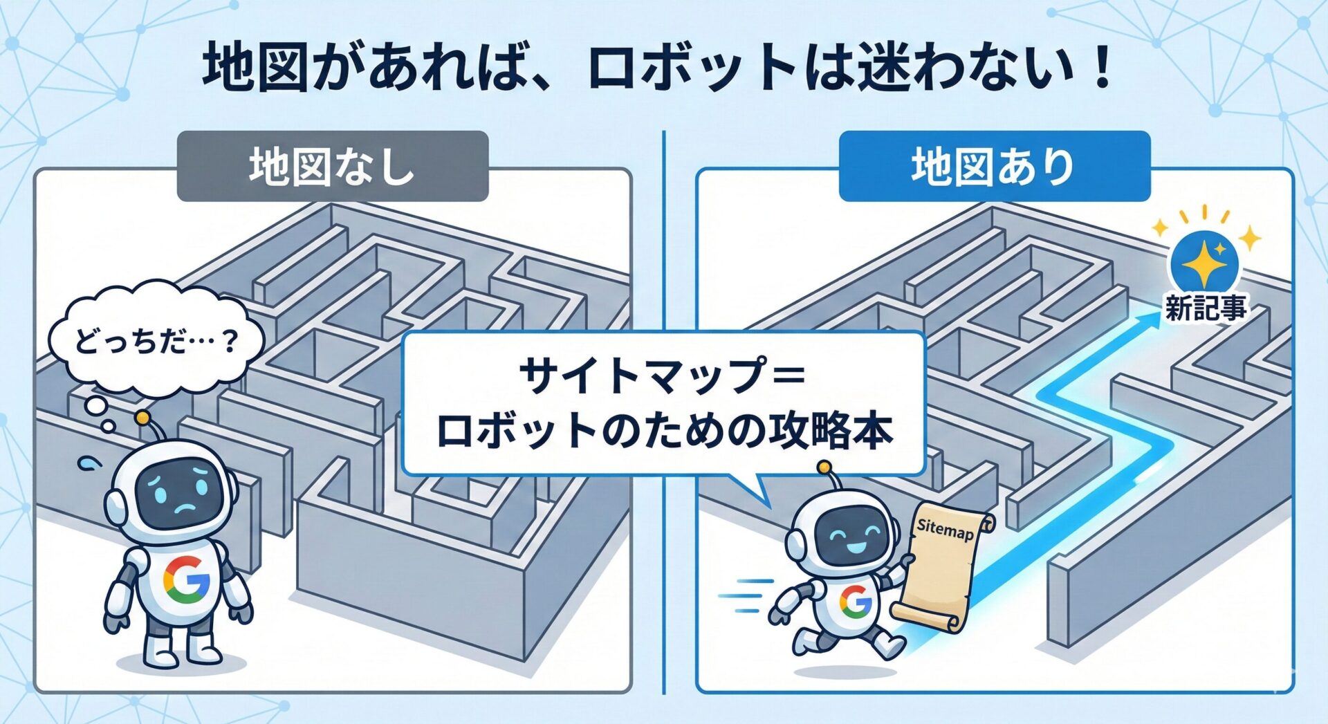 サイトマップ(XML サイトマップ)を一言でいうと、Google の検索ロボット(クローラー)専用の「サイト内の地図」のことです。