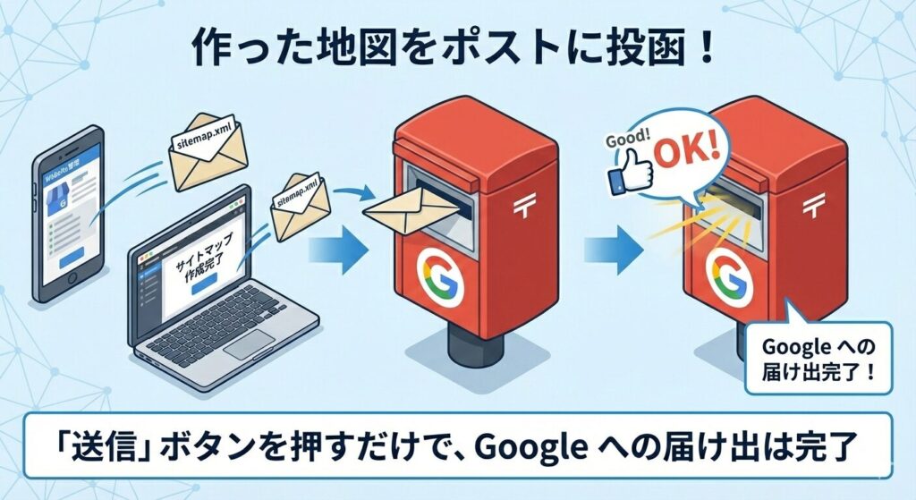 サイトマップができたら、Google に「地図ができたよ!」と届け出(送信)を行います。