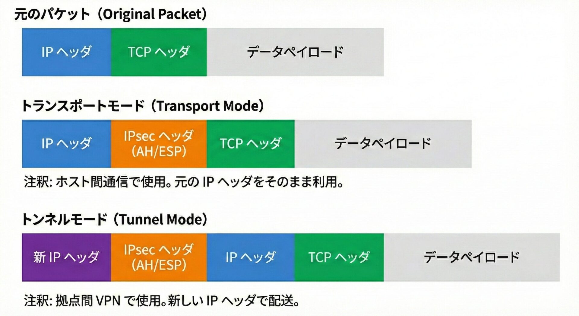 • トンネルモード: パケット全体を包み込む(拠点間 VPN 向け)