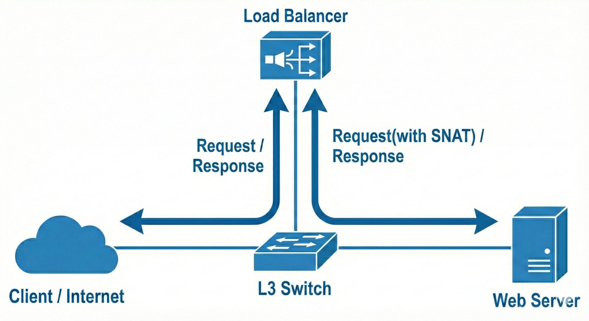 ワンアームデザインでは、ロードバランサーは単一のネットワークセグメントに接続されます。このデザインでは、インターネットからのトラフィックとバックエンドサーバー間のトラフィックが同じネットワークセグメントを共有することになりますが、VLAN を使用することでセグメントを分けることが可能です。SNAT(Source Network Address Translation)が使用され、クライアントの IP アドレスがロードバランサーの IP アドレスに変換されます。