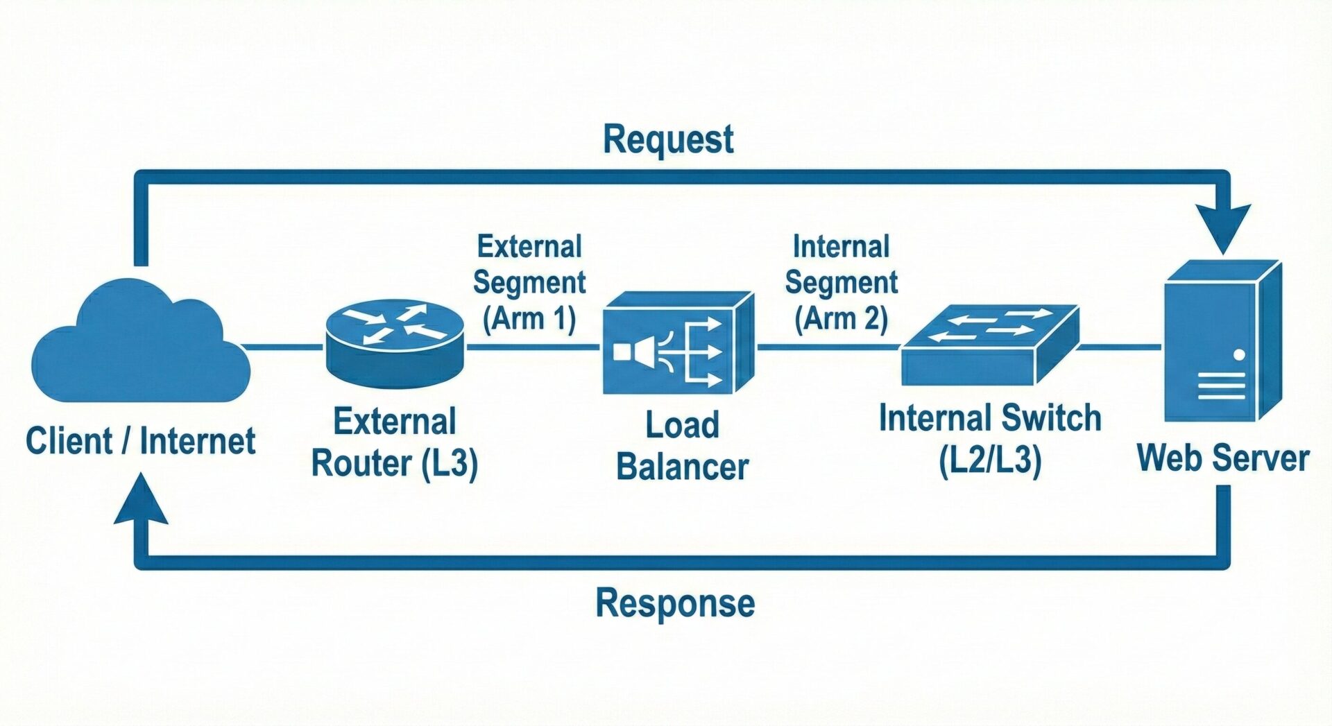 ツーアームデザインでは、ロードバランサーは 2 つの異なるネットワークセグメントに接続されます。通常、一方のインターフェイスはインターネットまたは外部ネットワークに接続し、もう一方のインターフェイスは内部ネットワークやバックエンドサーバーに接続します。これにより、インバウンドとアウトバウンドのトラフィックが分離され、セキュリティやパフォーマンスが向上します。