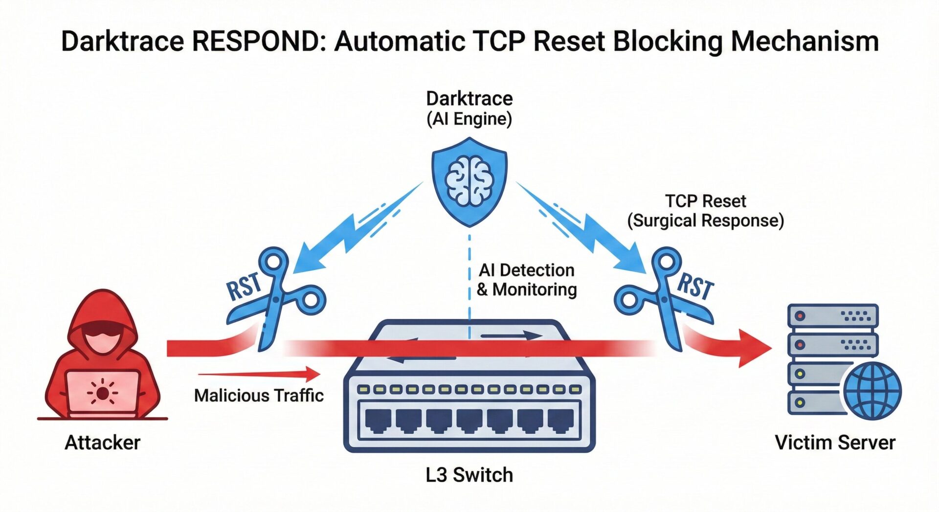 異常度が一定の閾値を超えた場合、AI が即座に介入し、「TCP リセット(TCP Reset)」 パケットを送信して通信を強制的に切断します。