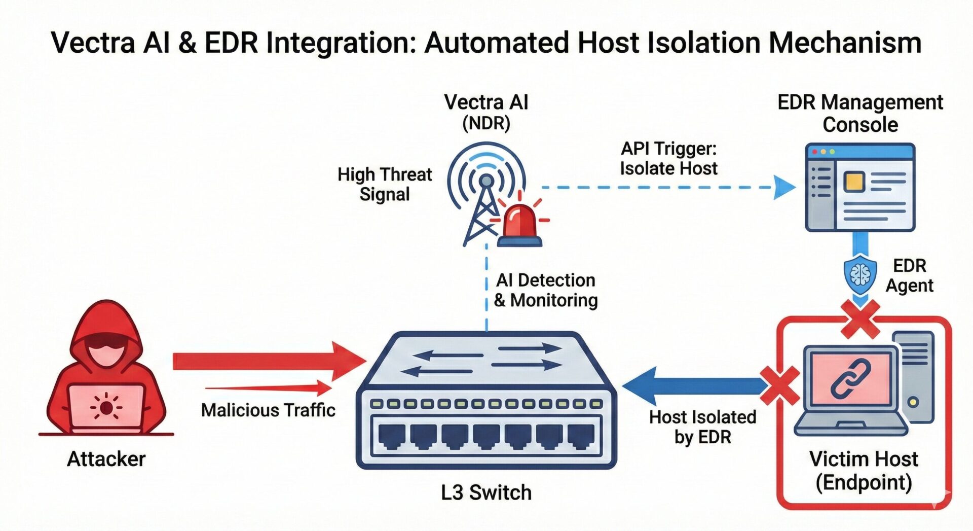 Vectra 自体は通信遮断の機能を(基本的には)持ちません。その代わり、主要な EDR 製品(CrowdStrike、SentinelOne、Microsoft Defender など)と深く連携します。 Vectra が「この端末が侵害されている(赤信号)」と判断すると、API 経由で EDR に指令を送り、「EDR 側で端末をネットワークから隔離する」という対処を自動または半自動で行うことができます。これにより、NDR の検知能力と EDR の対処能力を組み合わせた強力な防御体制を構築できます。
