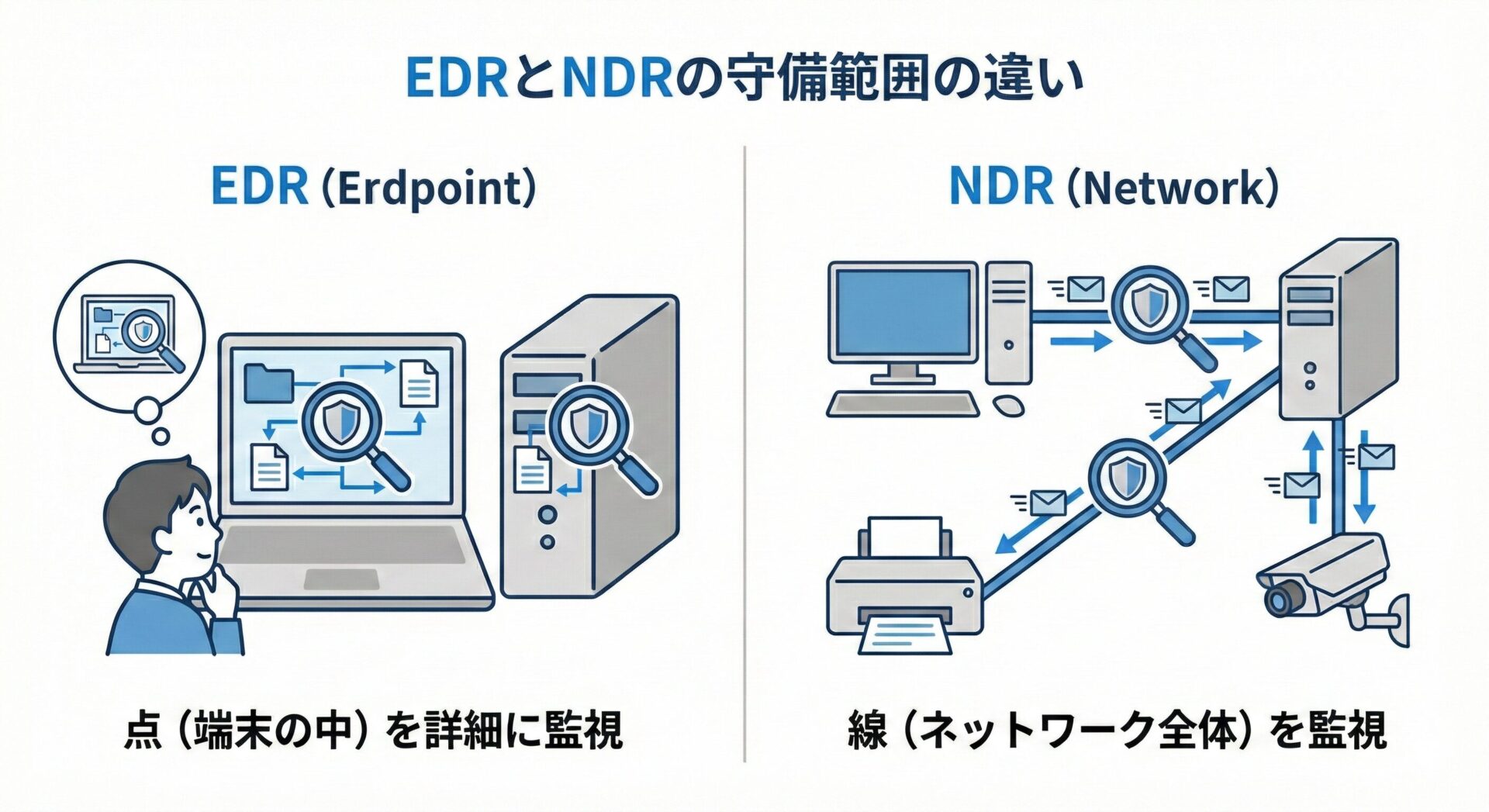 セキュリティ対策において、NDR と EDR はしばしば比較されますが、これらは「どちらかを選ぶ」ものではなく、「守備範囲が異なるため、両方組み合わせる」 のが正解です。